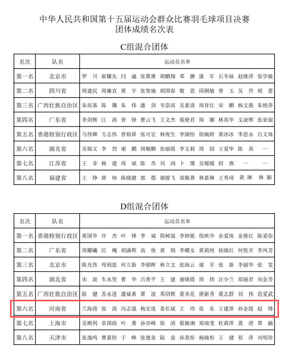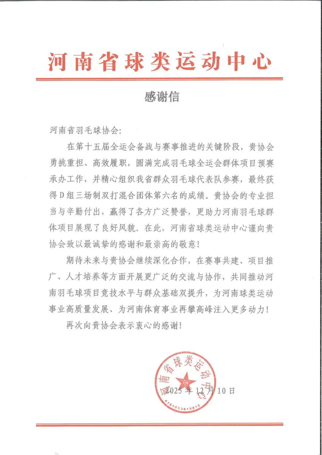在第十五屆全運會備戰期,河南省羽毛球協會圓滿完成全運會羽毛球群體項目預賽備戰工作,助力我省群眾代表隊斬獲D組混合團體第六名。河南省球類運動中心特此發來感謝信,這份肯定讓全體羽球工作者備受鼓舞。