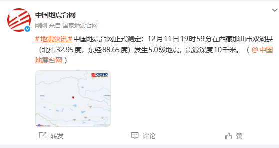 中國地震臺網正式測定:12月11日19時59分在西藏那曲市雙湖縣(北緯32.95度,東經88.65度)發生5.0級地震,震源深度10千米。