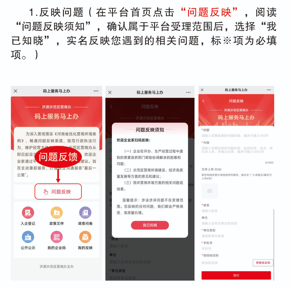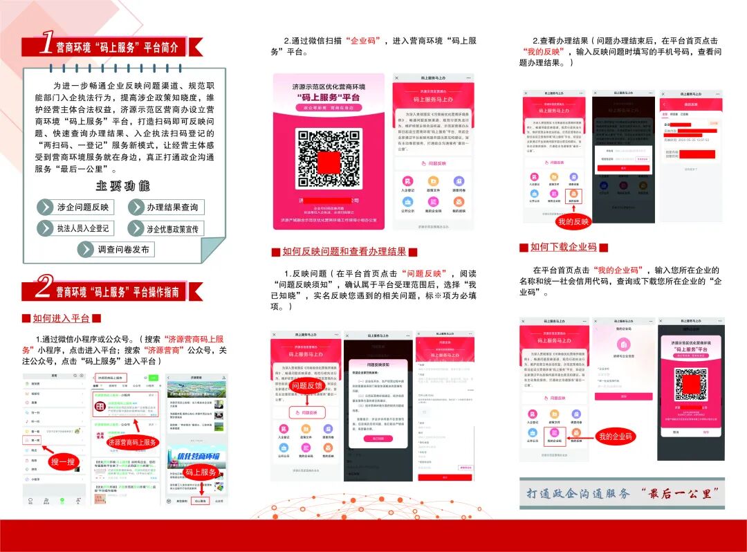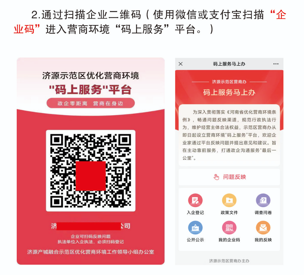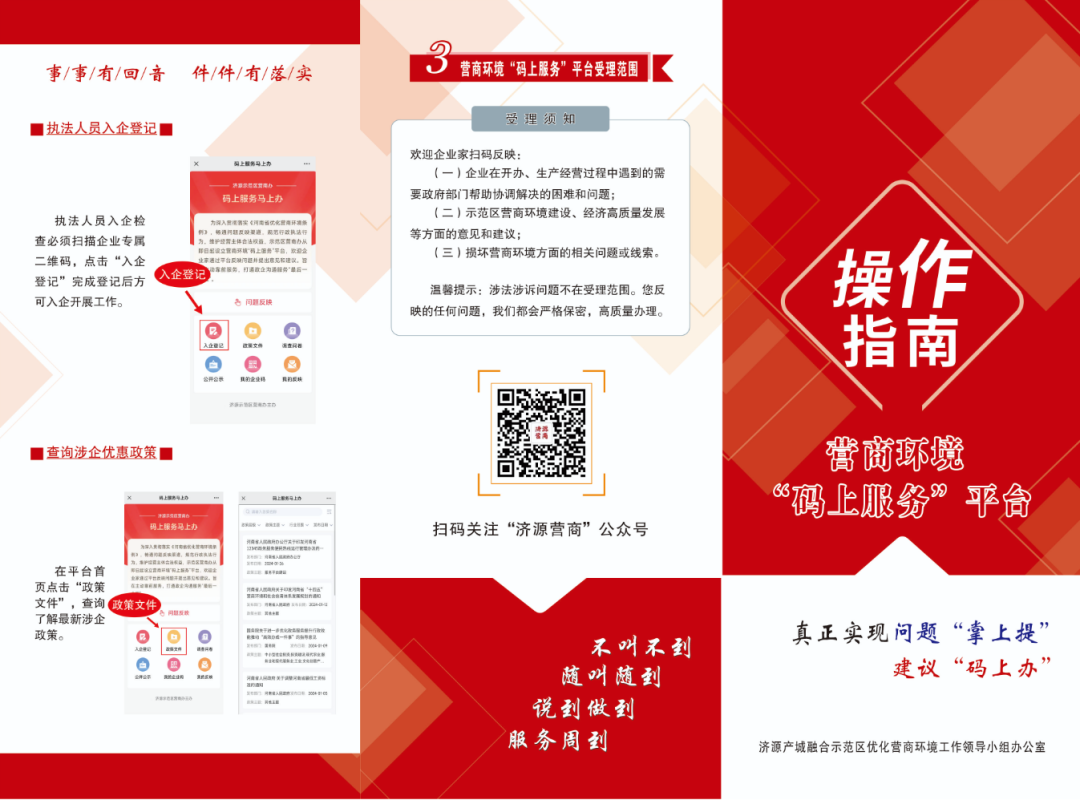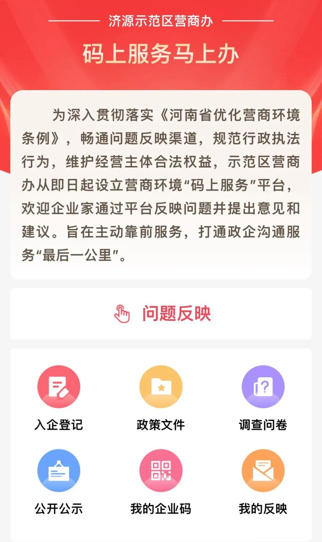 好的營商環境,就像陽光、水和空氣,為市場主體提供充沛的營養、生長的沃土。為進一步優化營商環境,濟源示范區開通了營商環境“碼上服務”平臺,暢通企業反映問題渠道、規范職能部門入企執法行為。