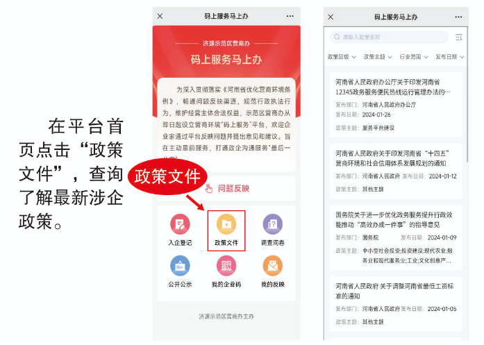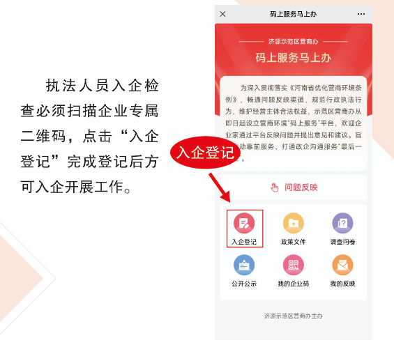 濟源示范區營商環境“碼上服務”平臺是一個集入企登記、政策宣傳、問題反映、問卷調查等多功能于一體的綜合性服務平臺。該平臺的建設打造了掃碼即可反映問題、快速查詢辦理結果、入企執法掃碼登記的“兩掃碼、一登記”服務新模式,讓經營主體感受到營商環境服務就在身邊,真正打通政企溝通服務“最后一公里”。