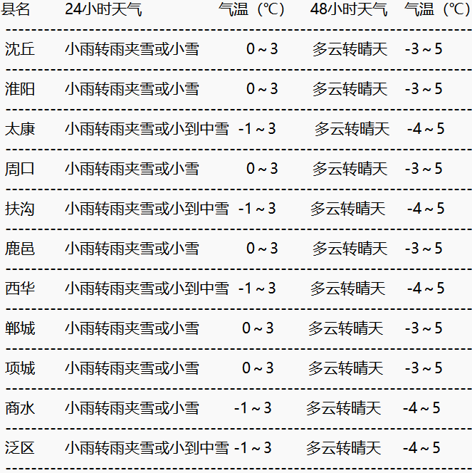 今天夜里多云轉陰天,明天白天小雨轉雨夾雪或小雪,西北部(扶溝、太康、西華、黃泛區)有小到中雪