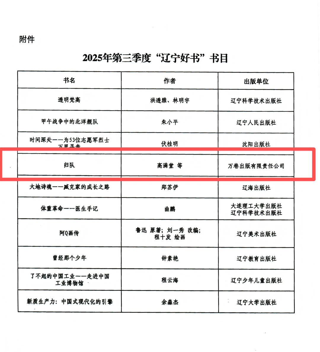 近日,2025年第三季度“遼寧好書”推選結果公布,由高滿堂、李立、汝盛、李洲創作,萬卷出版公司出版的長篇小說《歸隊》入選2025年第三季度“遼寧好書”榜單。