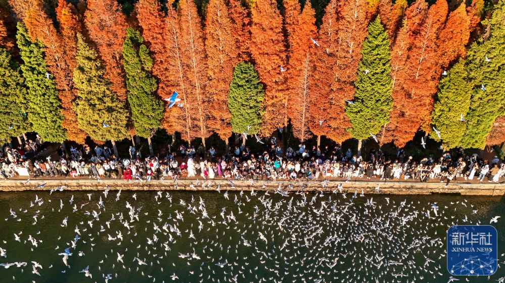 ↑ 12月10日,游客在滇池畔的海洪濕地公園喂紅嘴鷗(無人機照片)。