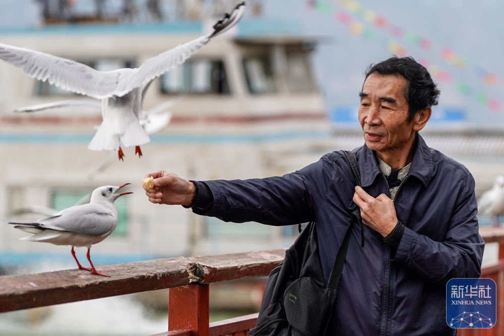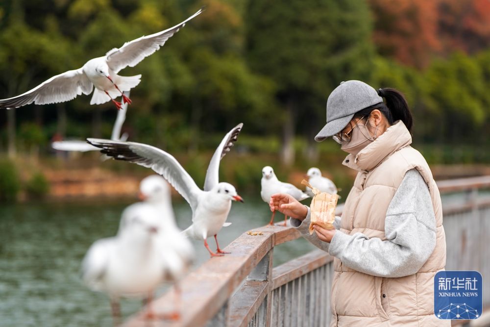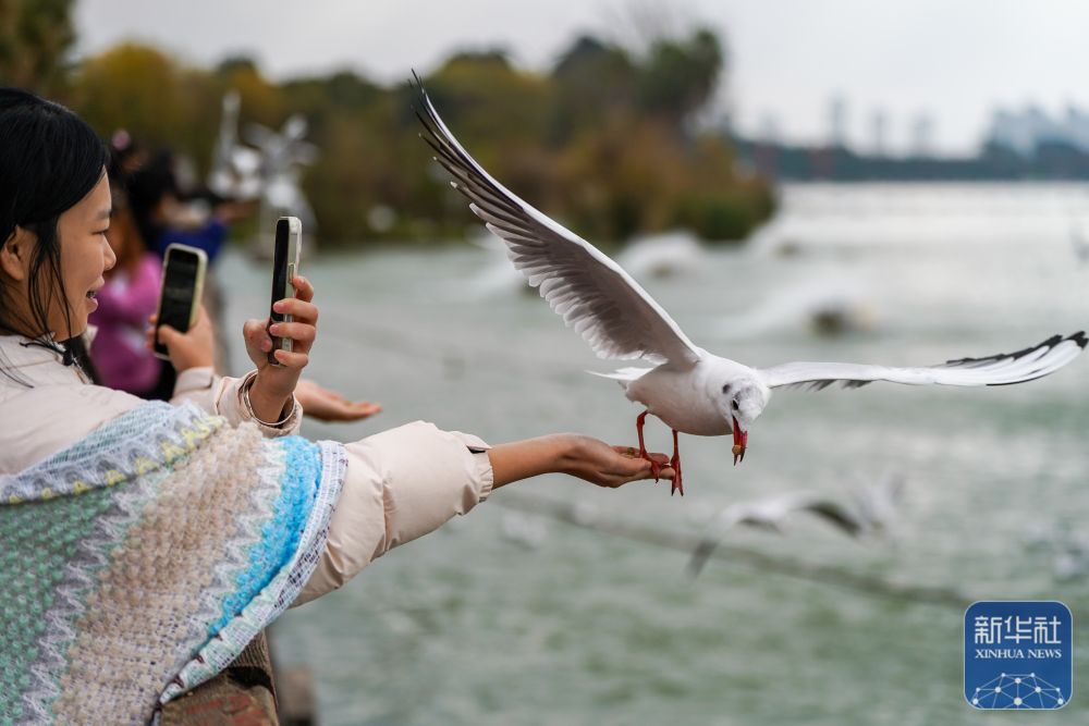 ↑ 12月11日,游客在滇池畔的星海半島生態濕地喂紅嘴鷗。