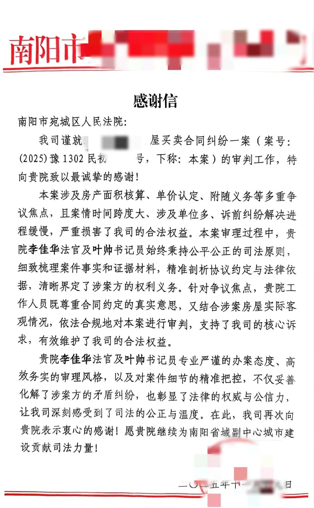 “李佳華法官和葉帥書(shū)記員以專(zhuān)業(yè)嚴(yán)謹(jǐn)?shù)霓k案態(tài)度、高效務(wù)實(shí)的審理風(fēng)格,以及對(duì)案件細(xì)節(jié)的精準(zhǔn)把控,不僅妥善化解了矛盾糾紛,也彰顯了法律的權(quán)威與公信力。在此,我司向宛城法院表示衷心的感謝。”這是原告某公司向南陽(yáng)市宛城區(qū)人民法院行政審判庭(綜合審判庭)李佳華法官團(tuán)隊(duì)送來(lái)的感謝信中的一段話。