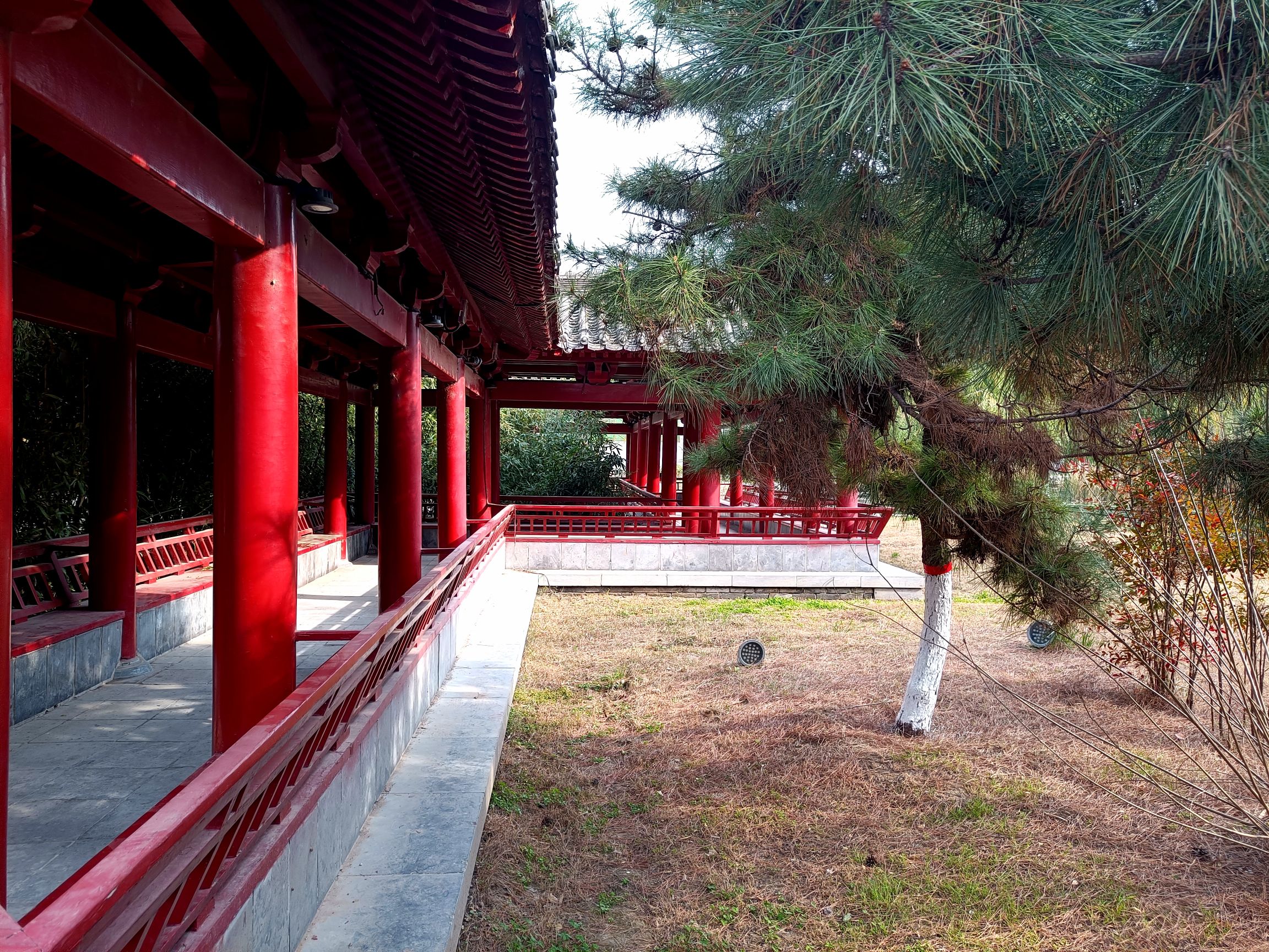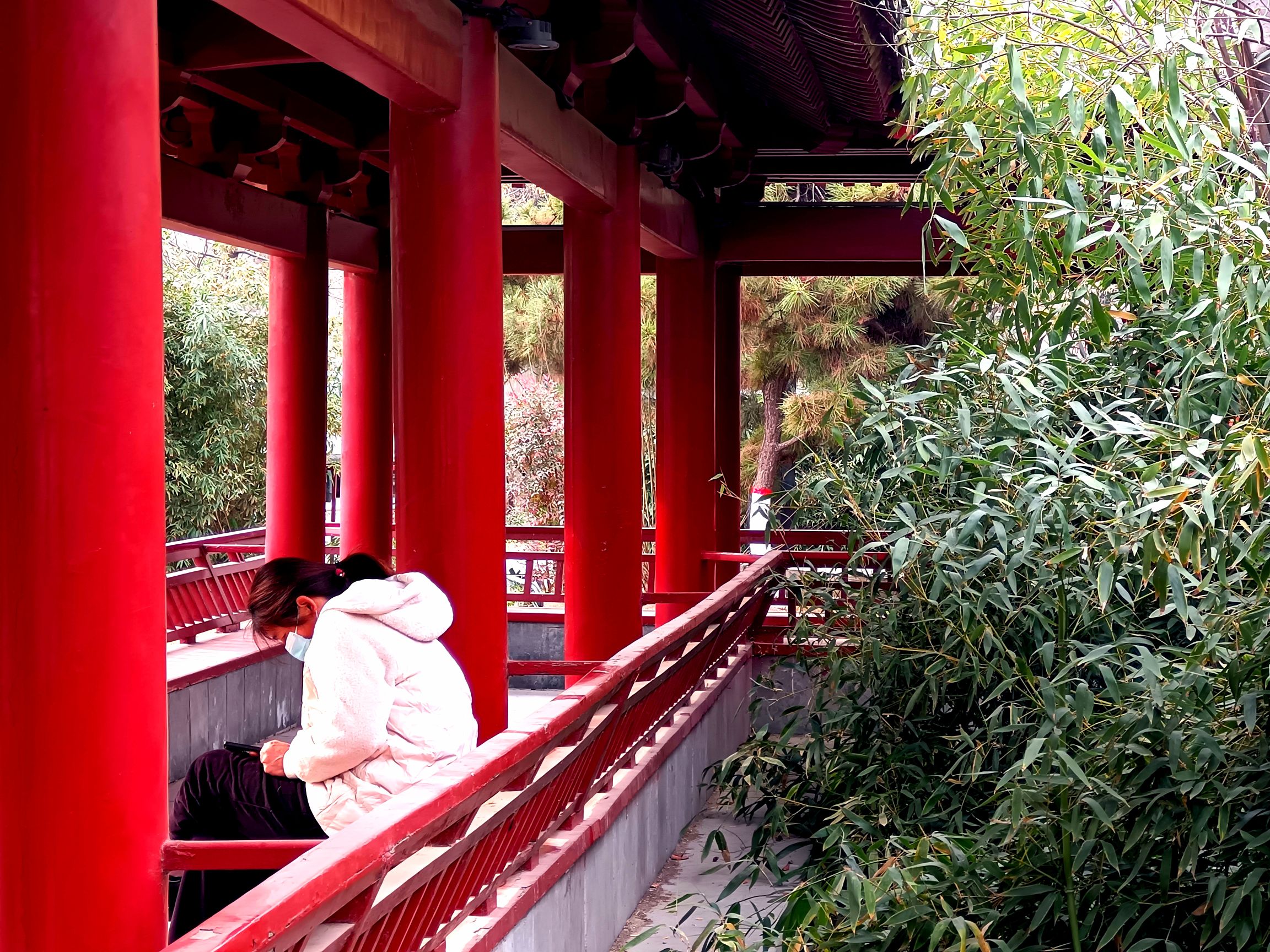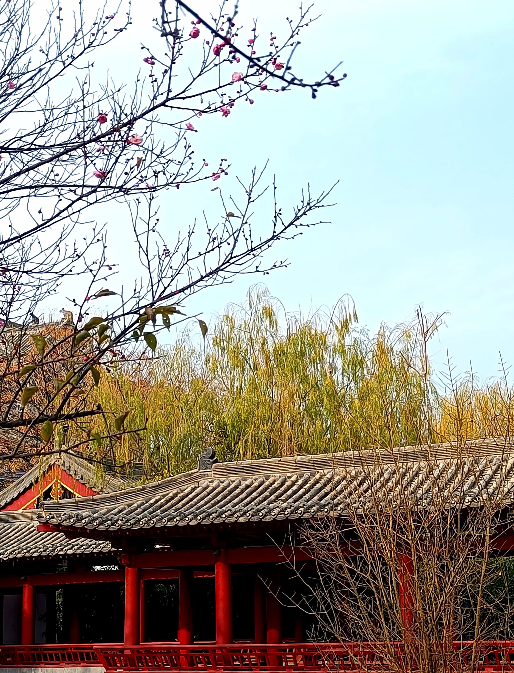 “回廊仙臺(tái)望舟舫,紅梅翠竹傲冰霜”的詩意,在此隨處可尋。歲寒三友:蒼松如披甲衛(wèi)士靜立畫舫旁,默默守護(hù)著往來游人;翠竹郁郁翠綠,點(diǎn)點(diǎn)紅梅漸漸綻放,再襯上朱紅的畫舫廊道,紅綠交織間,景致愈發(fā)鮮活?yuàn)Z目。