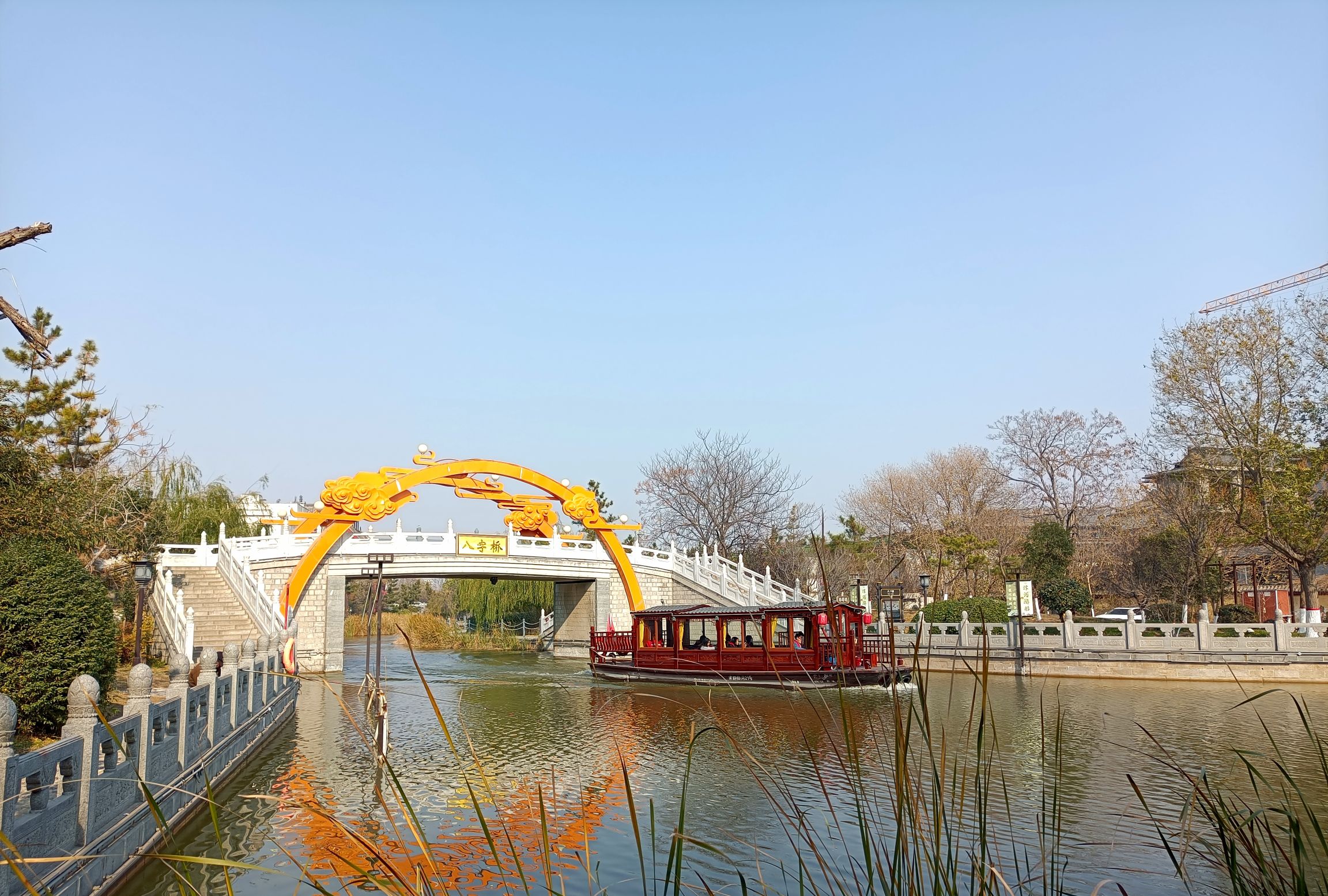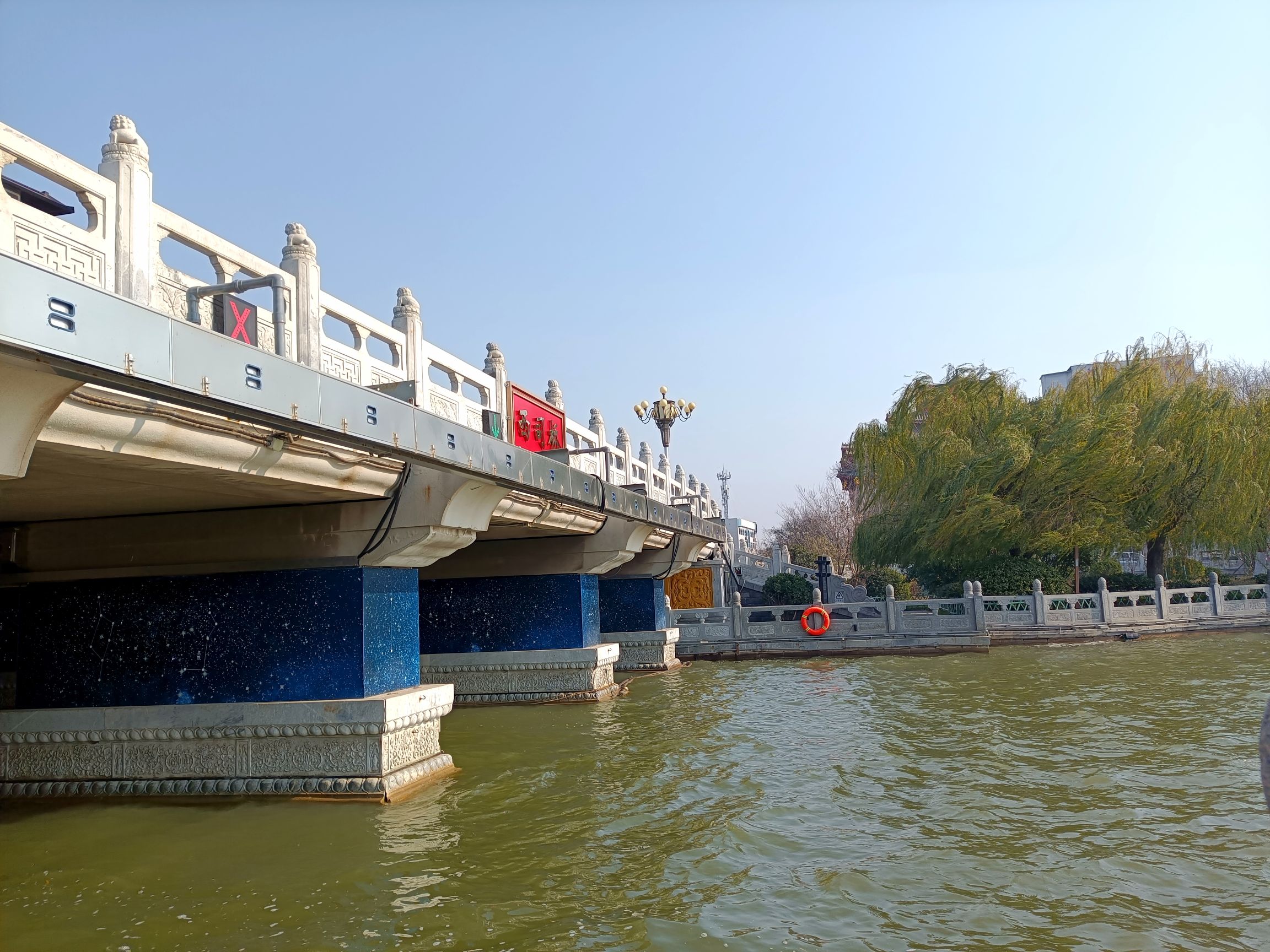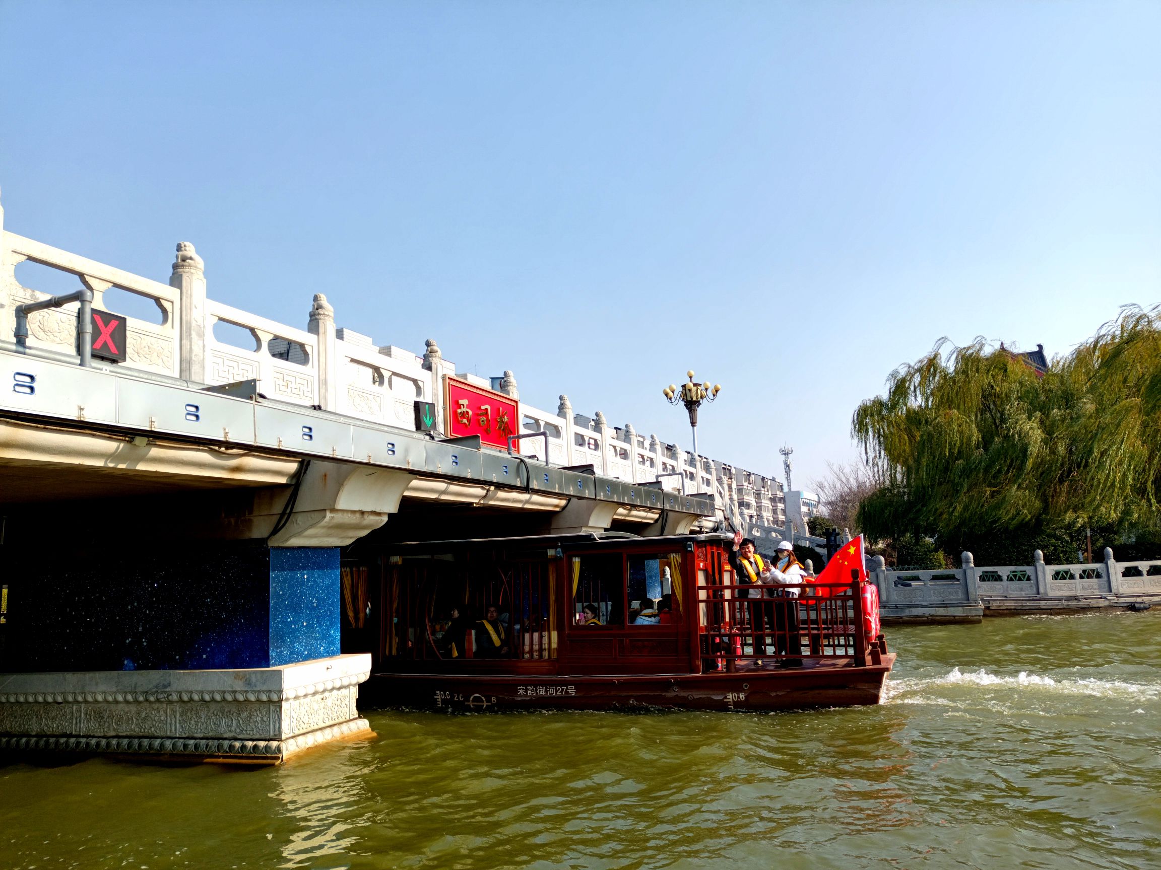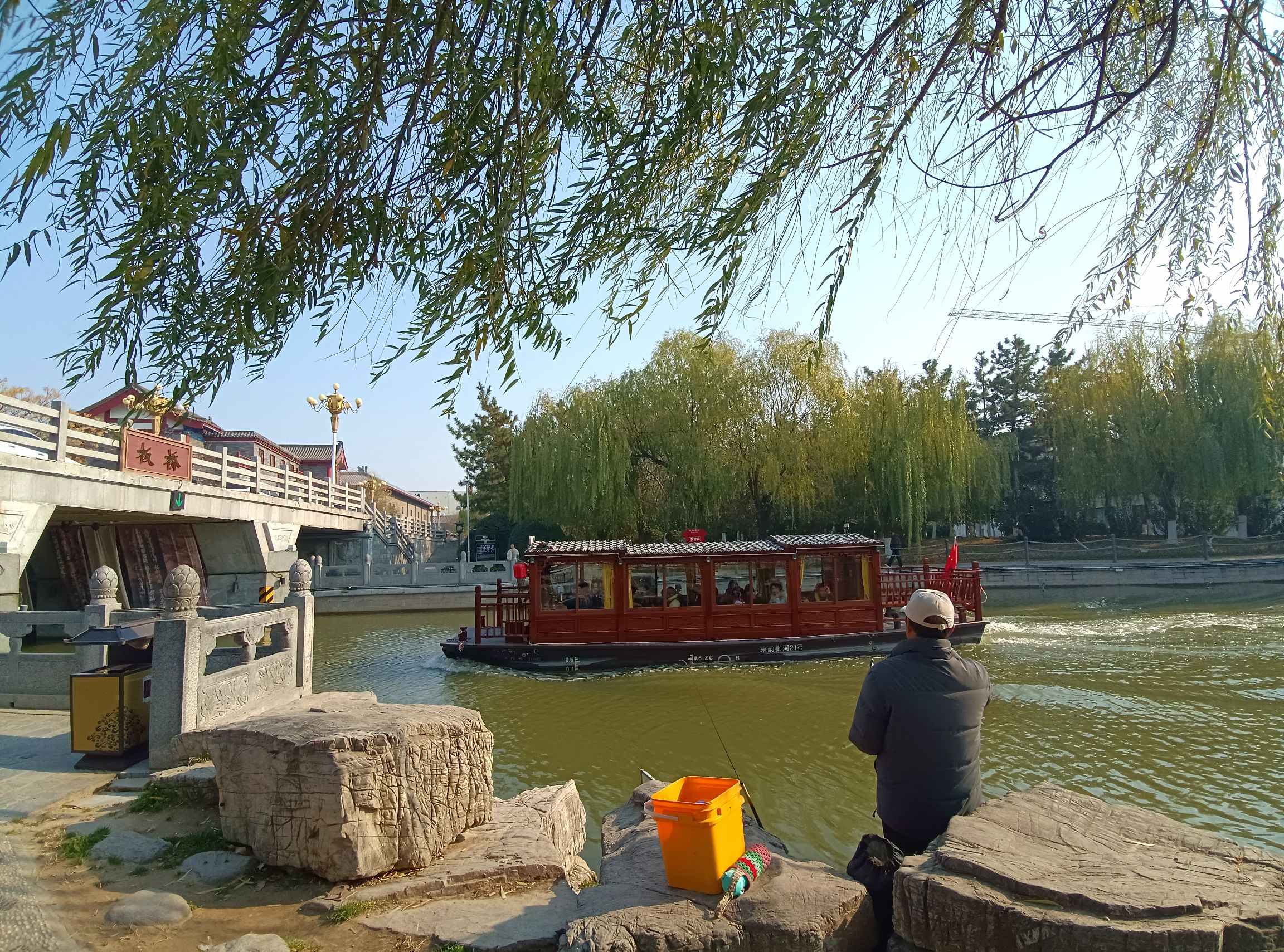 時(shí)至正午,西司橋上車流熙攘,橋下游船悠然駛過,岸邊楊柳依依,柔條拂水。游人駐足岸畔,舉手機(jī)定格眼前景;船中客亦抬手拍攝岸邊人,岸與船遙遙相望,人與景彼此相融,構(gòu)成一幅靈動(dòng)鮮活的市井畫卷。垂釣者,靜坐岸邊,在暖陽里靜享時(shí)光悠閑。