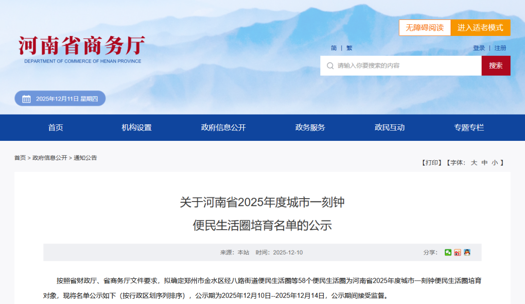 按照省財(cái)政廳、省商務(wù)廳文件要求,擬確定鄭州市金水區(qū)經(jīng)八路街道便民生活圈等58個(gè)便民生活圈為河南省2025年度城市一刻鐘便民生活圈培育對象,現(xiàn)將名單公示如下(按行政區(qū)劃序列排序),公示期為2025年12月10日—2025年12月14日,公示期間接受監(jiān)督。
