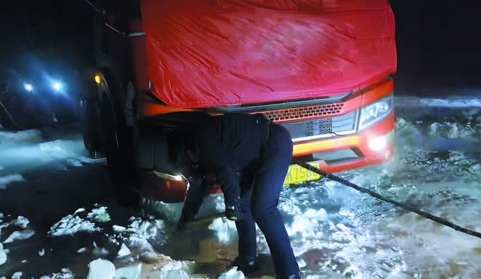 他們趕緊下車,首先來到貨車旁了解情況。駕駛人李師傅說:“路太滑,方向一偏就下去了,自己怎么也倒不出來!”烏漢圖跪在雪地里,將牽引繩兩端分別連接在警車尾部和大貨車前部的拖車鉤上。很快,連接處就結了一層薄冰。