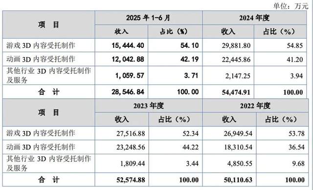 “游戲+動畫”也成為原力數(shù)字的重要營收來源。其中,來自動畫3D內(nèi)容受托制作的收入正在穩(wěn)步增長,2022年-2024年、2025年1-6月(下稱“報告期”),分別為1.83億元、2.32億元、2.24億元和1.2億元。
