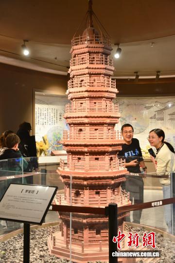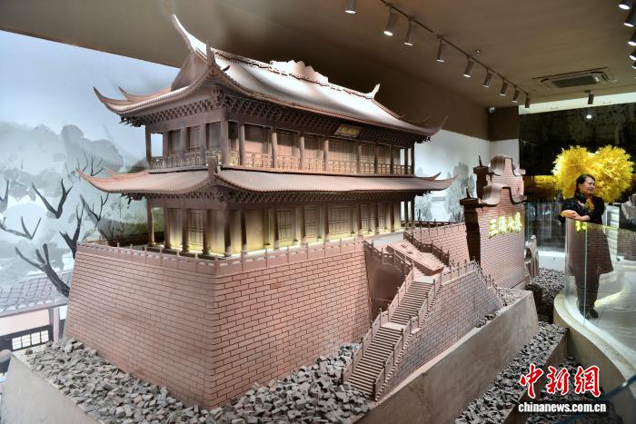 12月11日,用巧克力雕塑的羅星塔模型吸引參觀者。位于福州三坊七巷的巧克力博物館,館內(nèi)用巧克力制作的各類雕塑吸引民眾前來參觀。中新社記者 張斌 攝