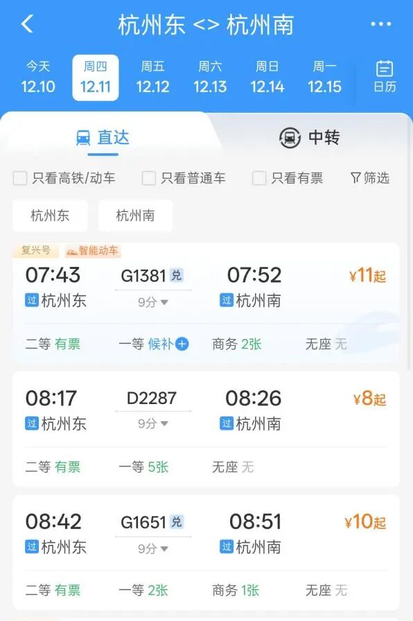 杭州東到杭州南站的高鐵耗時9分鐘,收費(fèi)8-10元