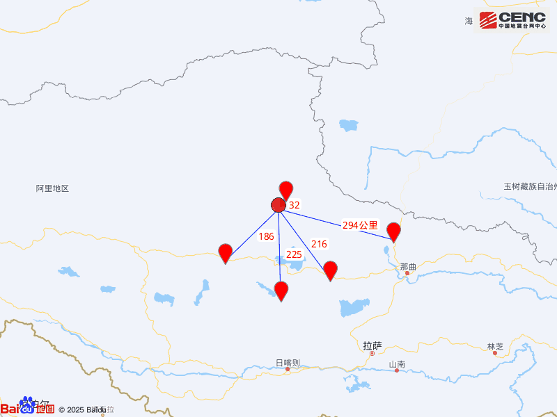 周邊縣城:震中距雙湖縣32公里、距尼瑪縣186公里、距班戈縣216公里、距申扎縣225公里、距安多縣294公里,距西藏那曲市360公里,距拉薩市436公里。