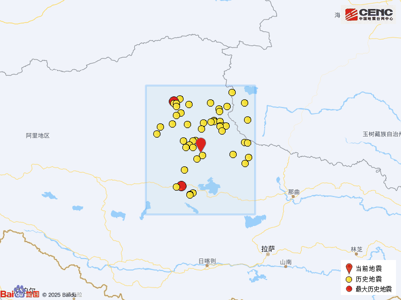 歷史地震:根據中國地震臺網速報目錄,震中周邊200公里內近5年來發生3級以上地震共65次,最大地震分別是2021年11月30日在西藏那曲市雙湖縣發生的5.8級地震(距離本次震中148公里)和2021年3月30日在西藏那曲市雙湖縣發生的5.8級地震(距離本次震中183公里),按震級大小前50次歷史地震分布如圖。