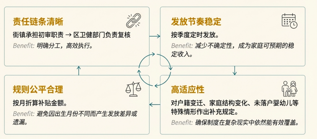 公共支持能否真正觸達家庭,關鍵在于地方治理能力。上海的實踐展示了一個成熟的執行樣本: 街鎮承擔初審職責,區衛健部門負責審核,使責任鏈條明確;按季度發放保證節奏穩定,減少資金進入家庭的時間不確定性;按月折算避免因出生月份不同而產生沖突或遺漏;對戶籍變遷、家庭結構變化與未落戶嬰幼兒的情形作出補充,使制度具備更強適應性。