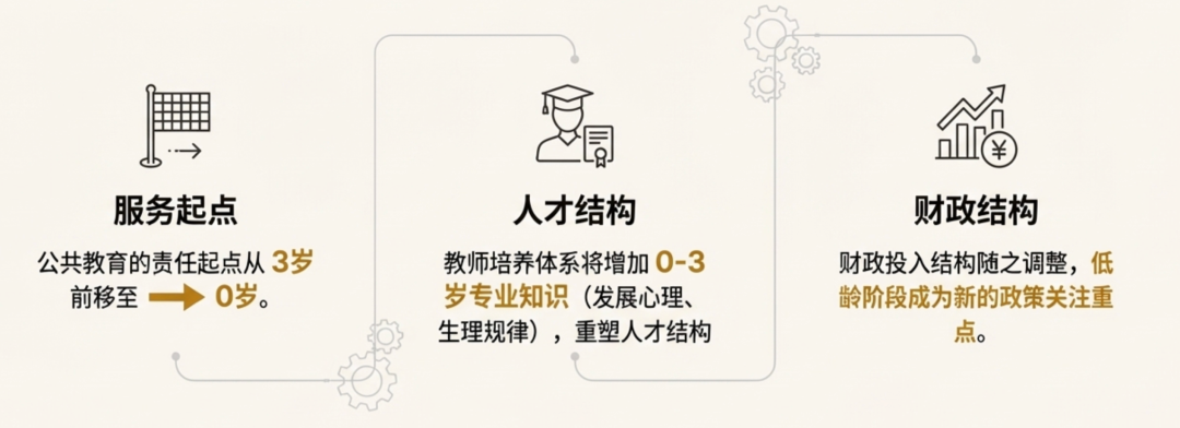 教師培養體系也將隨之調整。面向 0 到 3 歲的專業知識,包括發展心理、生理規律與家庭支持方法,將成為教師培養的重要組成部分。這將重塑教育行業的人才結構,使其能夠更早、更有效地承接兒童發展。