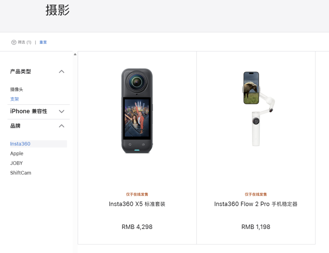 2018年影石推出Insta360 One,蘋果就第一時間將其引入自家直營店和線上商城,放在“iPhone配件”的條目之下。