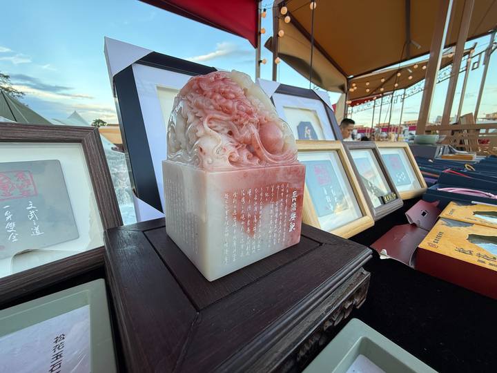 據了解,松花石是吉林省新三寶之一,具有溫潤如玉、質堅而細、色嫩而純、滑不拒墨、澀不滯筆的特點,深受文人墨客喜愛。彭祖述藝術館館長張家寧介紹,為了讓更多人了解松花石,豐富松花石的應用場景,特開發了迷你小硯臺、冰箱貼、手把件、祈福掛牌、百家姓穿帶印等產品,并將彭祖述先生的書法和篆刻元素融入其中。“我們這次來主要是想把吉林省省級非遺代表性項目彭氏微刻和特有的松花石、松花硯推廣到海南,讓大家更加了解吉林的特色。”