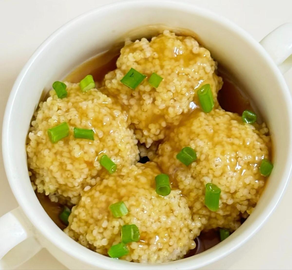 將肉餡團成小丸子,在泡好的小米里滾一圈,均勻裹上。