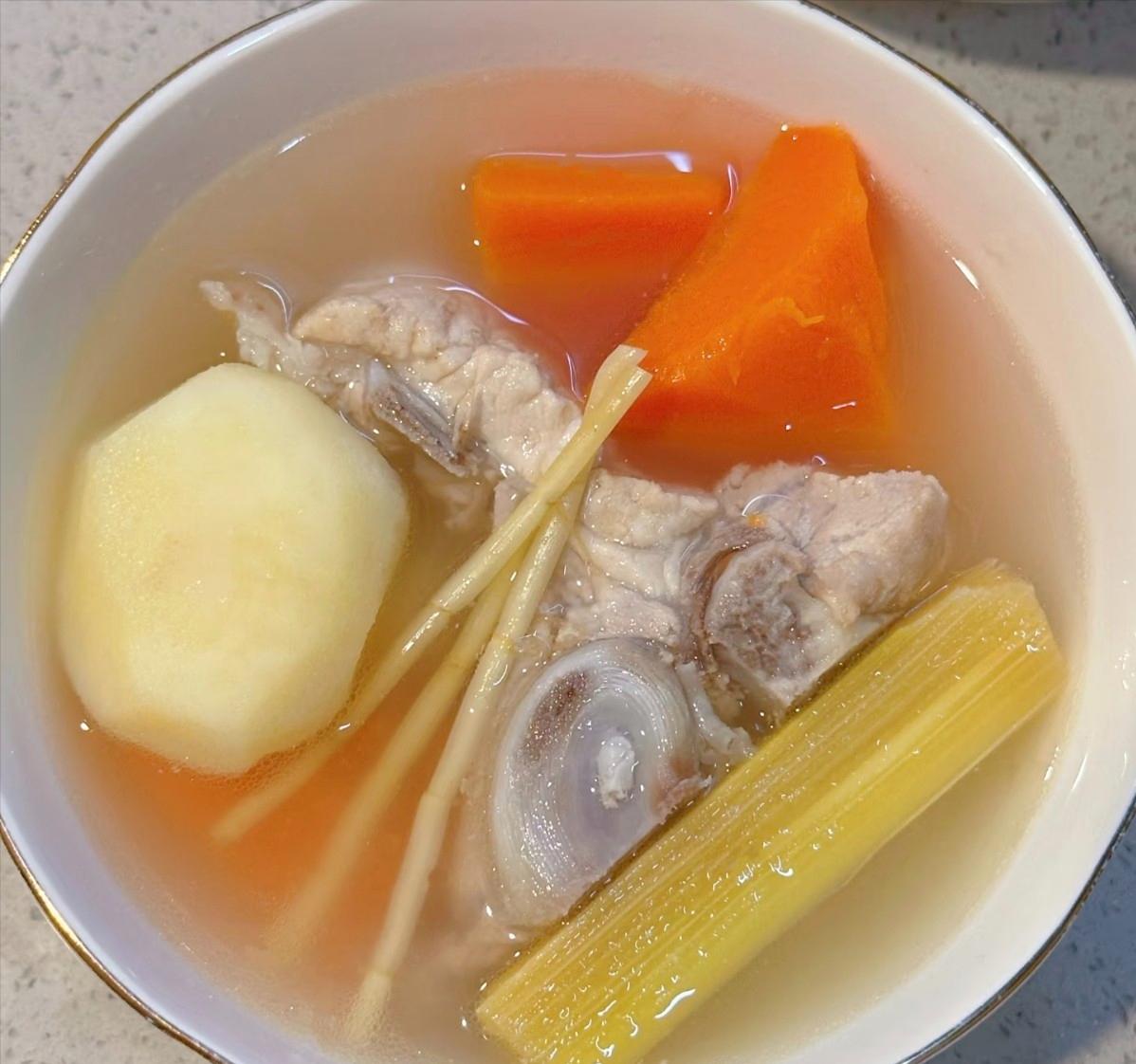 【食材】:豬脊骨、胡蘿卜、竹蔗、馬蹄、茅根、生姜、鹽