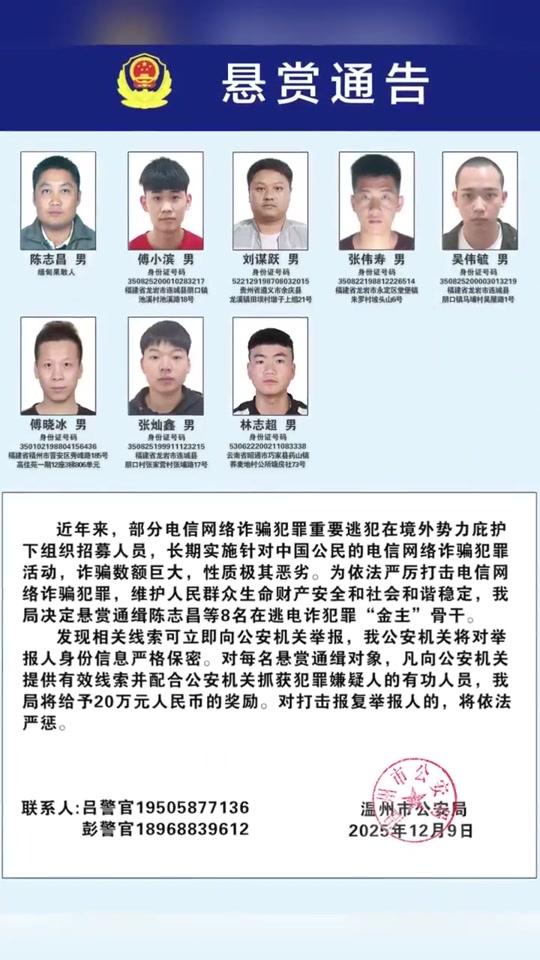 經(jīng)查,近年來,吳啟平、吳清正、傅小濱、歐長華等犯罪嫌疑人在境外勢力庇護(hù)下,組織招募人員,長期實(shí)施針對(duì)中國公民的電信網(wǎng)絡(luò)詐騙犯罪活動(dòng),詐騙數(shù)額巨大,性質(zhì)極其惡劣。特別是公安部部署開展打擊緬北涉我犯罪專項(xiàng)工作以來,在公安機(jī)關(guān)嚴(yán)打高壓態(tài)勢下,上述犯罪嫌疑人仍不收斂、不收手,繼續(xù)大肆組織實(shí)施違法犯罪活動(dòng)。該批在逃人員犯罪事實(shí)清楚、證據(jù)確鑿充分,浙江杭州、溫州,福建泉州、龍巖,河南平頂山,廣東深圳,云南昆明和重慶等地公安機(jī)關(guān)決定對(duì)其進(jìn)行公開懸賞通緝。