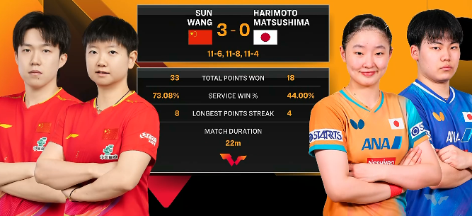 12月11日下午,WTT香港總決賽,混雙第一階段循環賽Group 1。混雙循環賽一場焦點大戰,莎頭組合以3-0的比分擊敗棟曼組合。具體賽果如下: