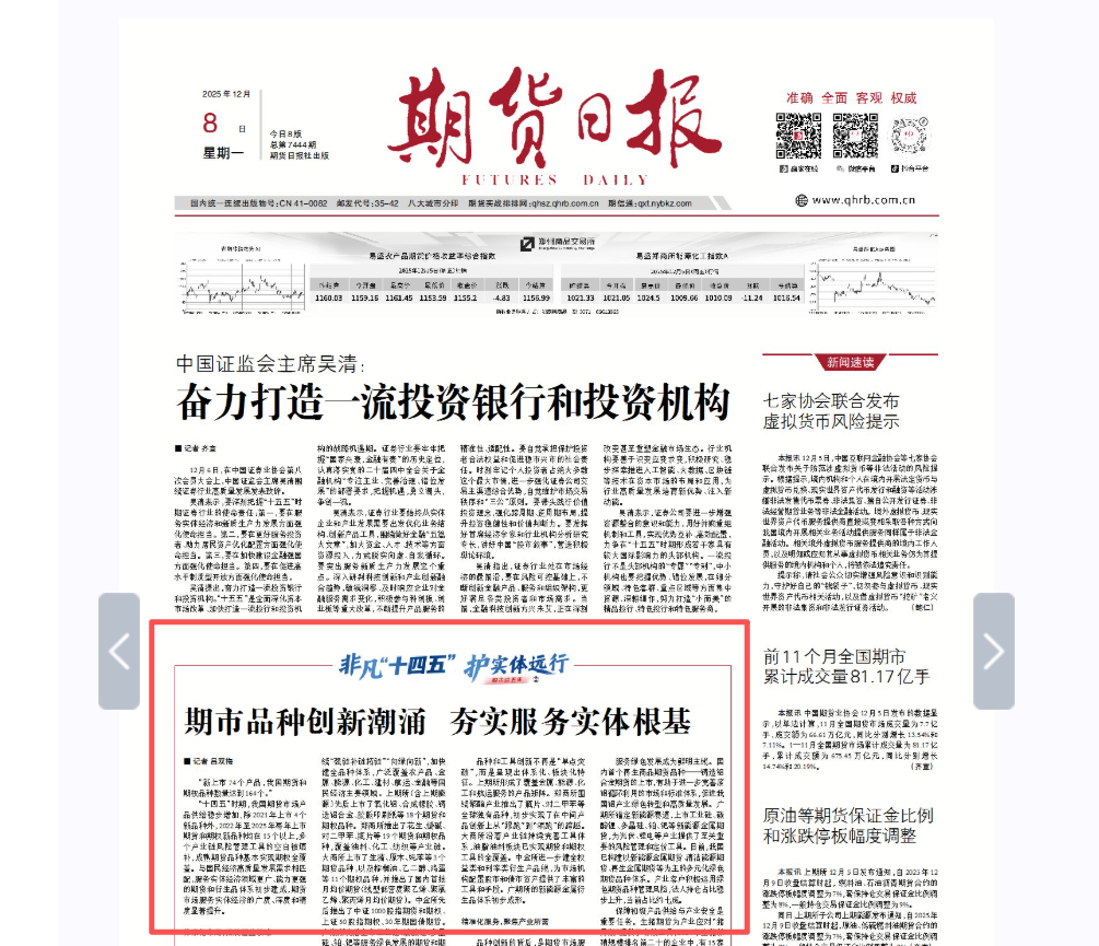 “十四五”時期,我國期貨市場產(chǎn)品供給穩(wěn)步增加,除2021年上市4個新品種外,2022年至2025年每年上市期貨和期權(quán)新品種均在15個以上,多個產(chǎn)業(yè)鏈風(fēng)險管理工具的空白被填補,成熟期貨品種基本實現(xiàn)期權(quán)全覆蓋。與國民經(jīng)濟高質(zhì)量發(fā)展需求相匹配,服務(wù)實體經(jīng)濟領(lǐng)域更廣、能力更強的期貨和衍生品體系初步建成,期貨市場服務(wù)實體經(jīng)濟的廣度、深度和精度顯著提升。