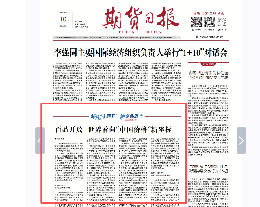 “十四五”時期,隨著合格境外投資者可交易品種數量破百,“中國價格”的影響力正跨越地緣邊界,擴大至全球市場。這場品種擴容、規則對接的開放進程,不僅讓“中國價格”成為跨境貿易的參考坐標,更催生出適配全球產業的新型風險管理生態。當“中國價格”在國際市場獲得更多定價共鳴時,中國期貨市場正以“定價之錨”的姿態,推動風險管理工具從虛擬數字走向產業實踐,成為全球產業鏈穩健運行的溫暖護航者。