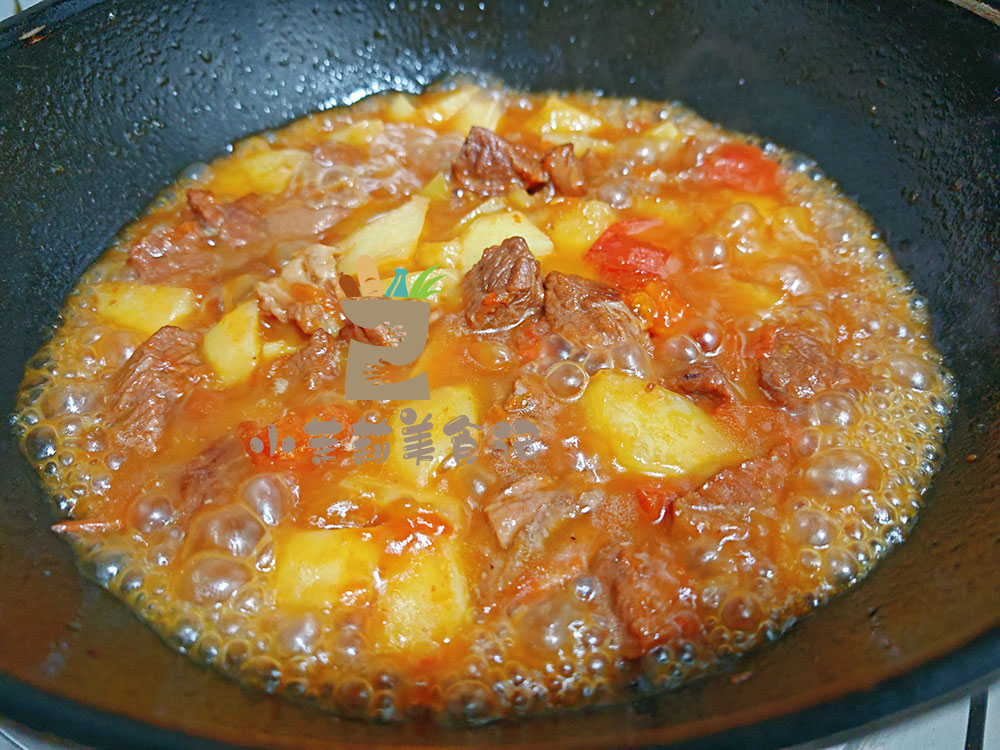 3、重新把鍋洗干凈燒干燒熱,少許油淋進去,肉倒里邊,快速炒到收緊的狀態,倒些番茄塊,蔥姜,老抽,炒到上色后,這個時候要加熱水,加足后,加一把葡萄干,轉小火燉。