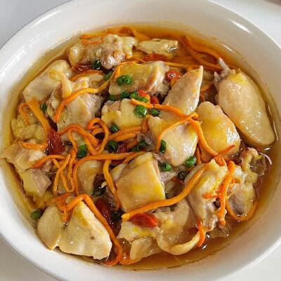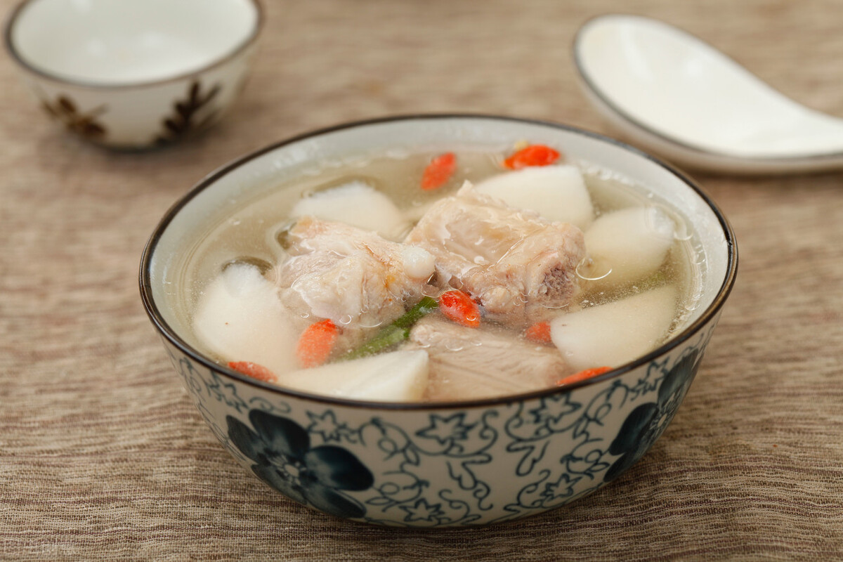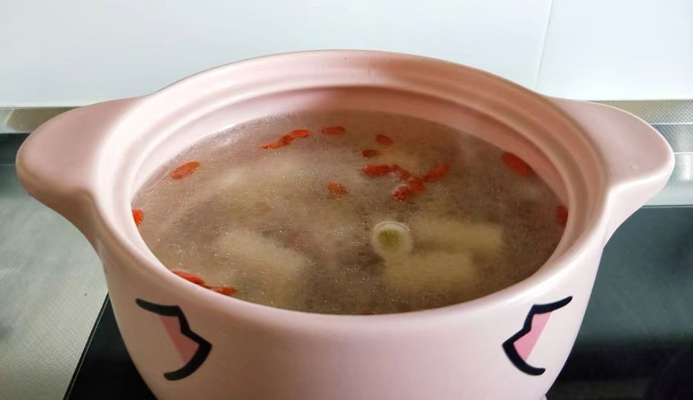 4、重新在鍋里添上干凈的飲用水,小排第二次放進去,丟入蔥姜先燉一個鐘頭。這個時候把山藥倒里邊,火候調大些,繼續燉四十分鐘,最后補點鹽,抓一小把枸杞撒里邊,即可關火。