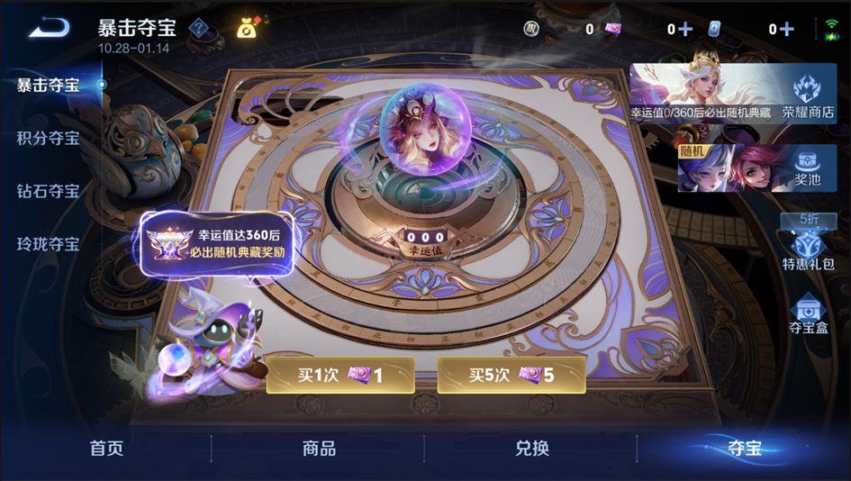 奪寶新增暴擊奪寶(限時開啟),每次參與有40%的概率獲得多倍幸運值(最高10倍),幸運值達到360之后可隨機獲得典藏皮膚、小兵皮膚、武則天,如果全部擁有則獲得榮耀水晶。這樣一來,典藏皮膚的價格至少打75折,難怪官方將皮膚品質定為:珍品無雙>榮耀典藏,這下價格就差不多了。