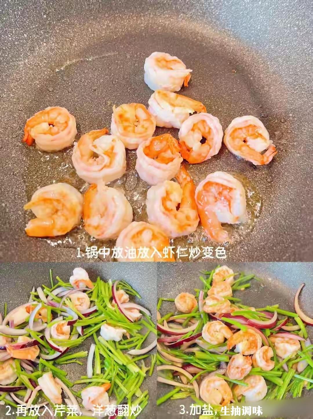 叮囑:芹菜焯水能保持翠綠和脆感。洋蔥炒到透明,甜味才出來。蝦仁不能炒老,變色就熟。這道菜講究快火快炒,保持食材的清爽。