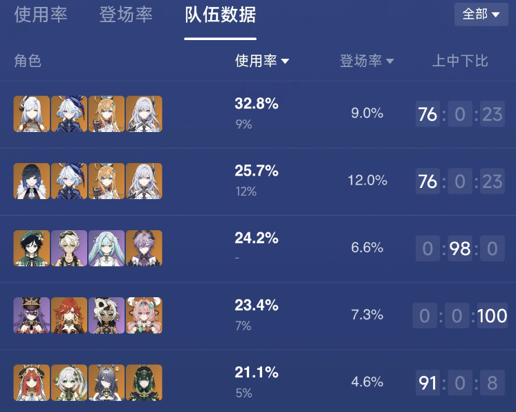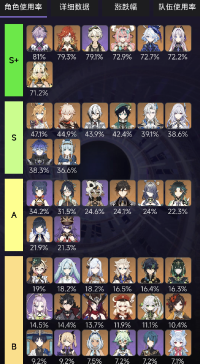 排名第十的是菈烏瑪,月體系本期排名相對較低,草神納西妲這波也是直接跌落前十,溫迪使用率雖說未進前十,但39%已經非常不錯,遠超過水龍王那維萊特。
