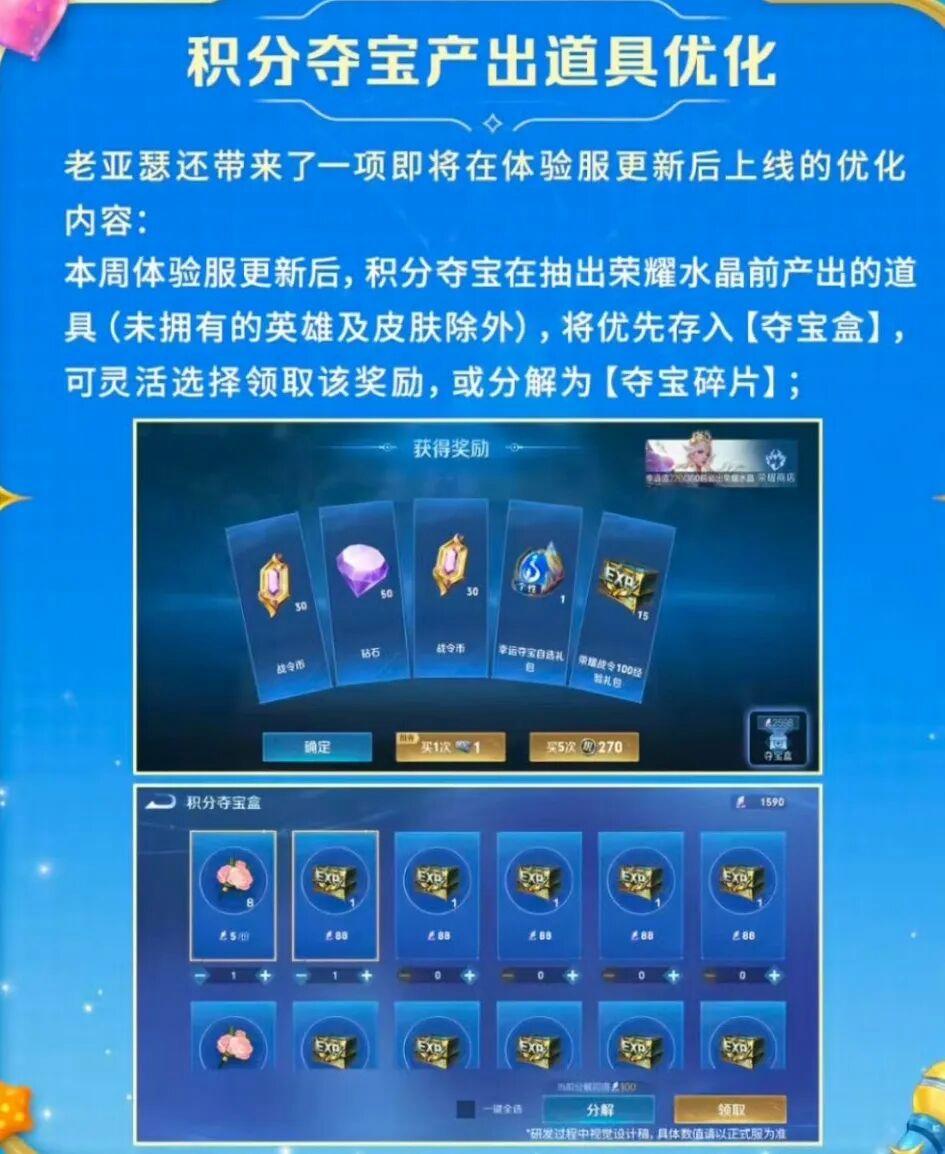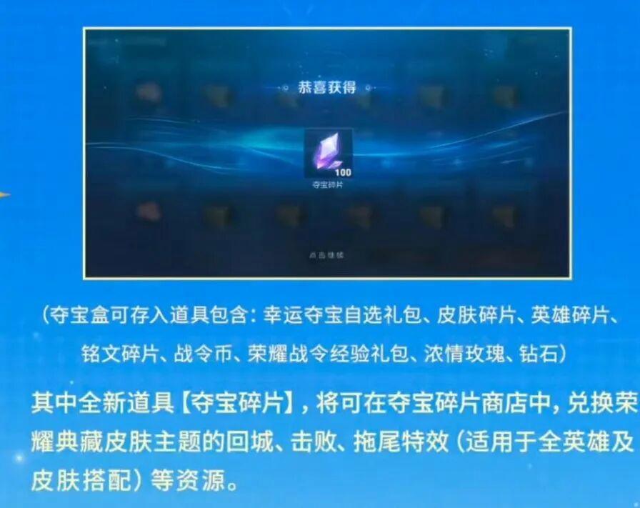 接下來,再說說王者榮耀積分奪寶的消息,S42賽季開始,積分奪寶新增分解功能,可以抽到的無用道具進行分解,分解得到的碎片。可以兌換典藏級回城特效等等,全皮膚通用。