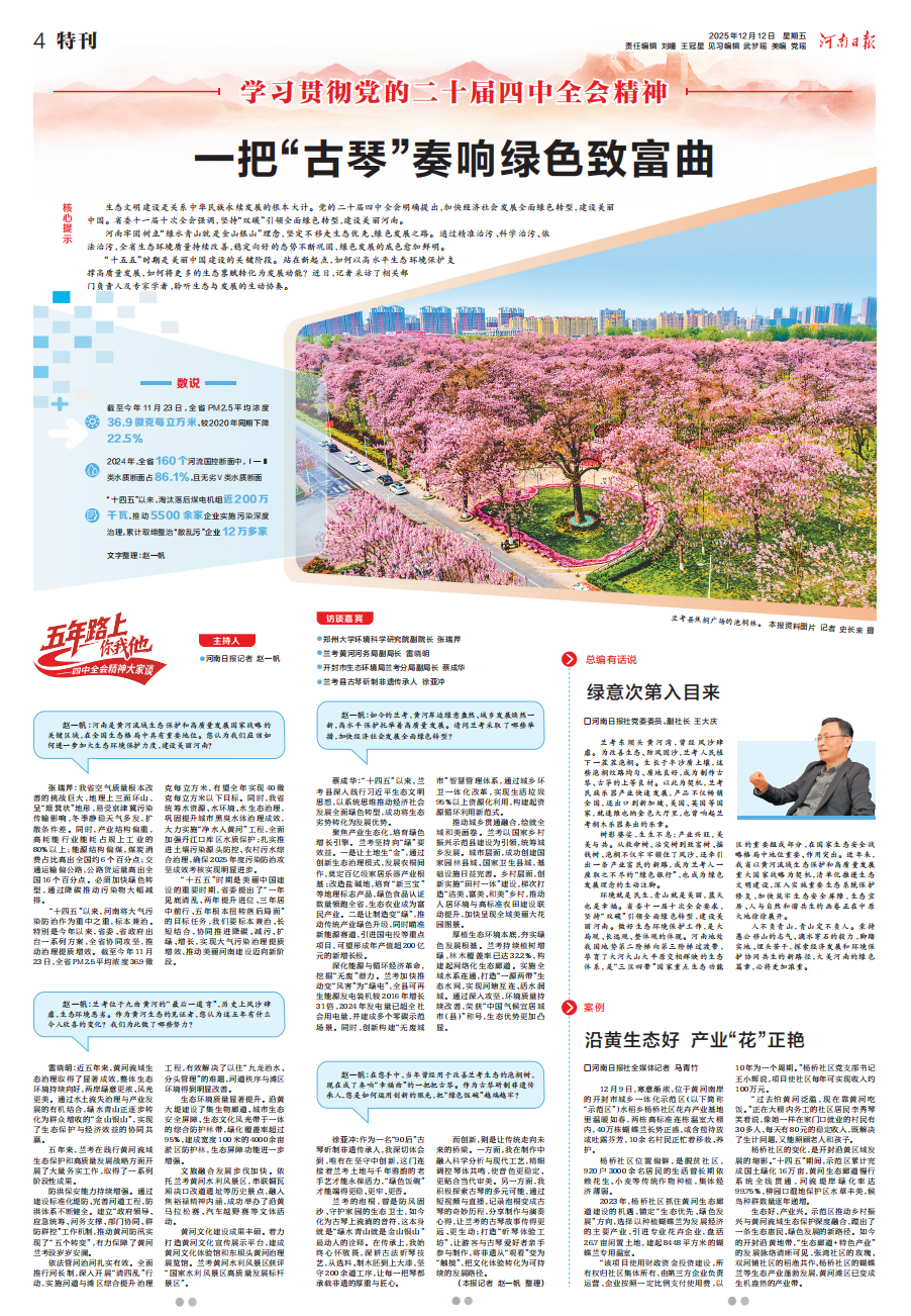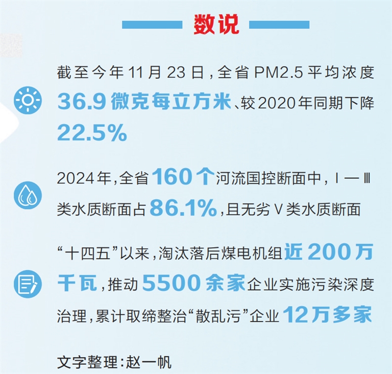 “十四五”以來,河南將大氣污染防治作為重中之重,標本兼治。特別是今年以來,省委、省政府出臺一系列方案,全省協同攻堅,推動治理提質增效。截至今年11月23日,全省PM2.5平均濃度36.9微克每立方米,有望全年實現40微克每立方米以下目標。同時,我省統籌水資源、水環境、水生態治理,鞏固提升城市黑臭水體治理成效,大力實施“凈水入黃河”工程,全面加強丹江口庫區水質保護;扎實推進土壤污染源頭防控、農村污水綜合治理,確保2025年度污染防治攻堅成效考核實現明顯進步。