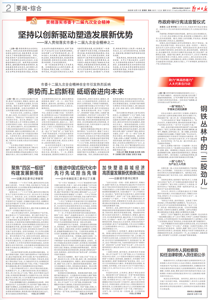 “這次全會是一次統一思想、凝聚共識、明確方向、鼓舞干勁的大會,特別是審議通過的《中共鄭州市委關于制定鄭州市國民經濟和社會發展第十五個五年規劃的建議》,以恢宏視野勾勒未來發展路徑、以系統思維部署戰略任務,為我們做好下一步工作指明方向、劃出重點。”新密市委書記程洋表示,新密市將聚焦“兩高四著力”,堅持“三標”引領,緊緊對標全會作出的建設“八個強市、一個中心”的新部署新要求,將藍圖細化為舉措、將愿景轉化為實績,真正以高水平落實推動高質量發展,為鄭州加快國家中心城市現代化建設貢獻更多力量。詳情點此查看>>>