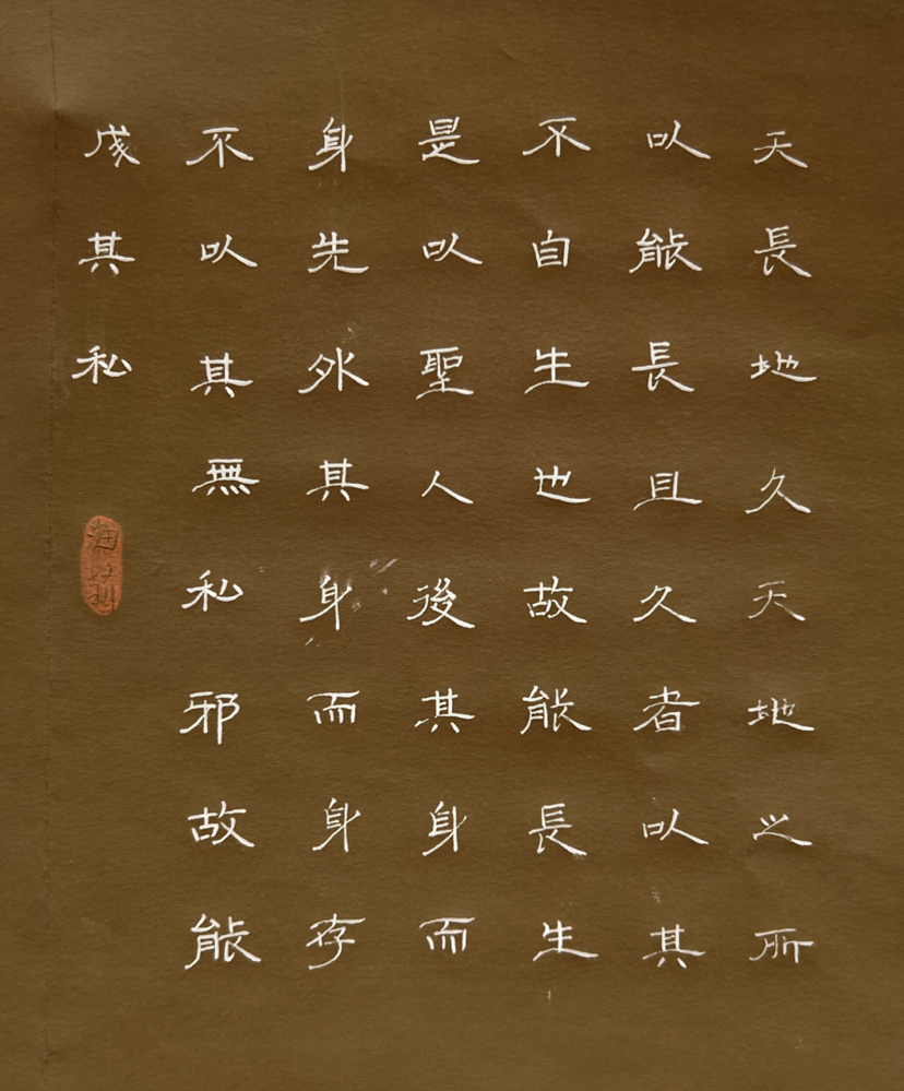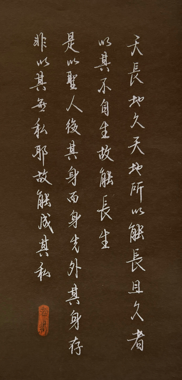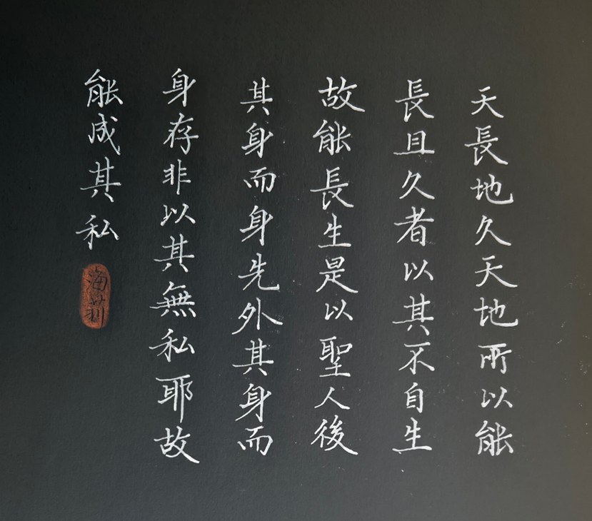 《道德經》第七章里寫:"天長地久。天地所以能長且久者,以其不自生,故能長生。是以圣人后其身而身先,外其身而身存。非以其無私邪?故能成其私。"這段話用天地長久的道理,引出圣人處世的智慧——不把自己的利益放在首位,反而能得到大家的推崇;不執著于自身得失,反而能讓自身更穩固。