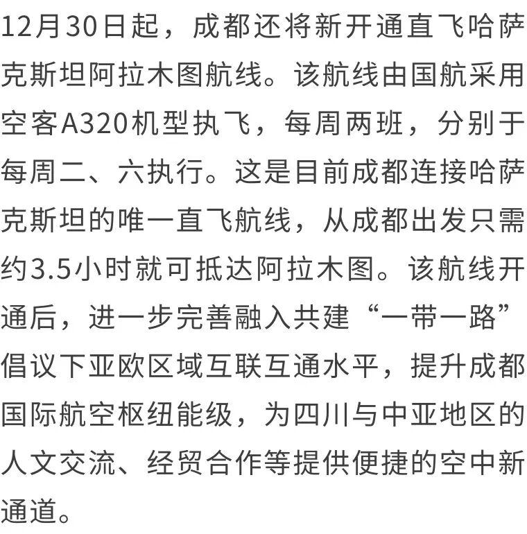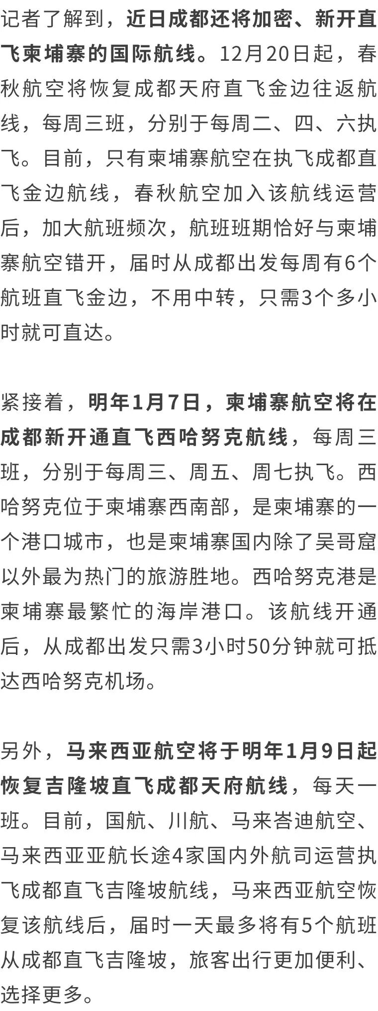 12月10日,記者從市口岸物流辦和相關航司獲悉,12月28日起,成都將新開通直飛越南富國島航線,兩地之間的通達縮短至約4個小時,緊接著12月30日成都還將新開通直飛哈薩克斯坦阿拉木圖航線。另外,國內外航空近日還將在成都開通直飛柬埔寨金邊、西哈努克2條國際航線。