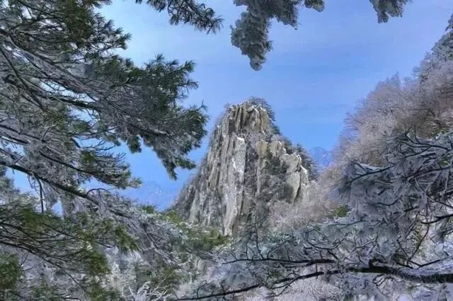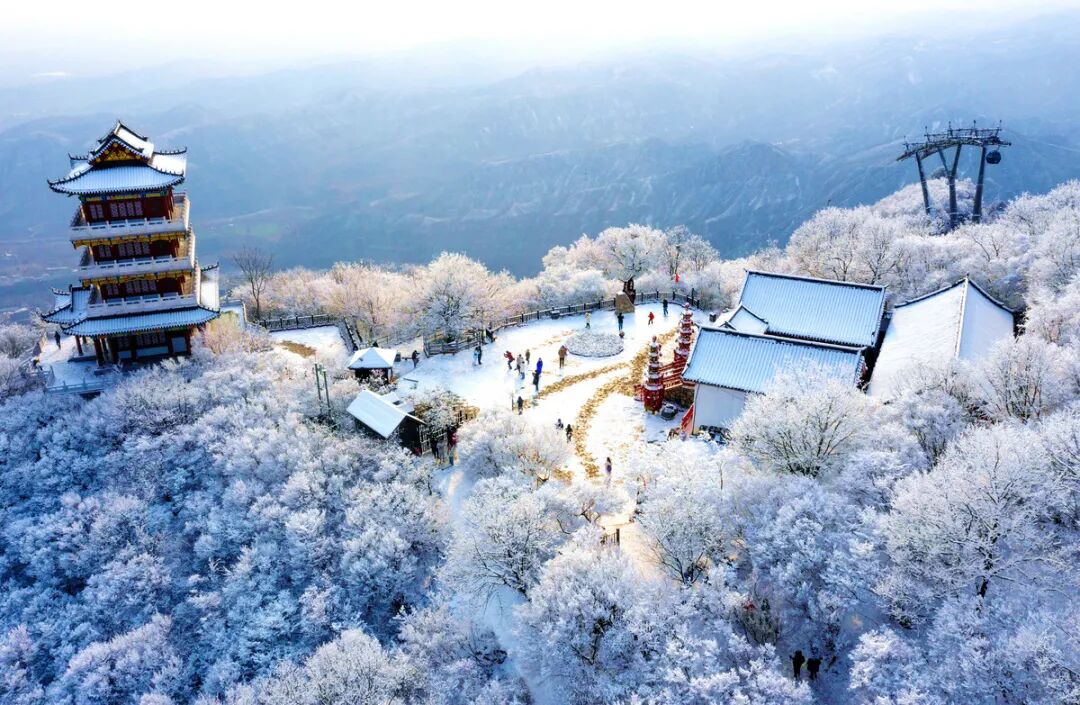 雪后,金殿映雪,棧道覆銀,奇峰裹上白紗,霧凇綴滿瓊枝。