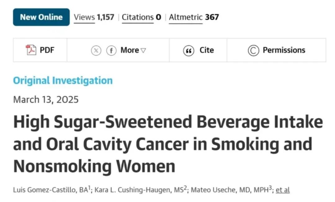 2025年《美國醫(yī)學(xué)會耳鼻咽喉頭頸外科雜志》刊發(fā)的一項納入約16萬名女性隨訪30年的研究發(fā)現(xiàn),不管是否抽煙、喝酒,與每月喝含糖飲料<1杯(約240毫升)的參與者相比,每天喝≥1杯含糖飲料的參與者,口腔癌風險飆升4.87倍。⑤