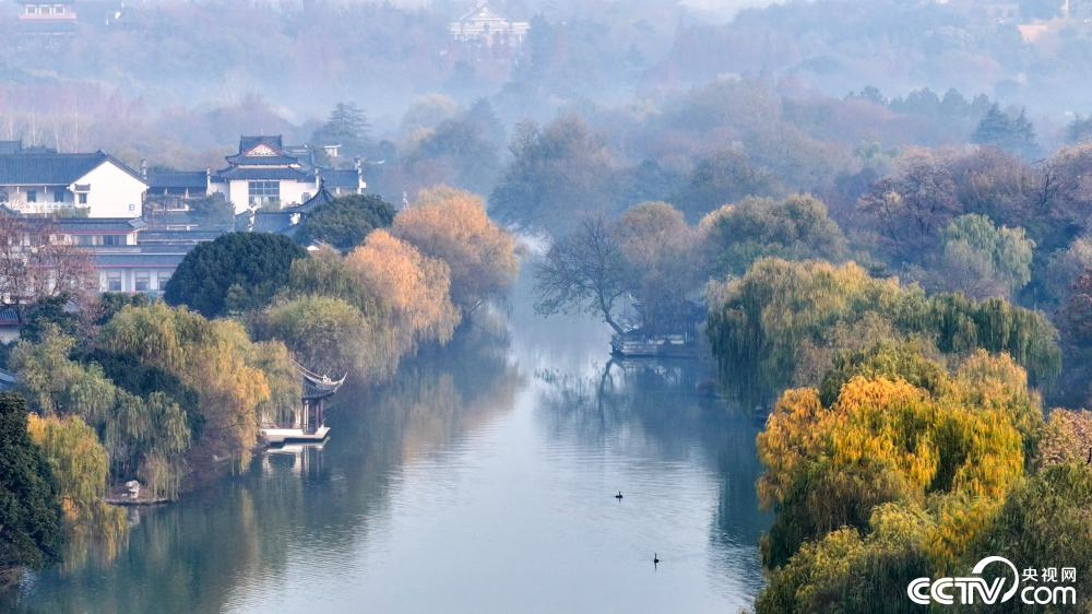 近日,江蘇揚州瘦西湖風景區出現冬霧天氣,五彩斑斕的樹木與亭臺軒榭籠罩在薄霧中,若隱若現,猶如水墨畫卷。