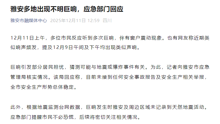 ·四川雅安多位市民稱聽到多次巨響,應急部門回應:未接到任何安全事故報告。