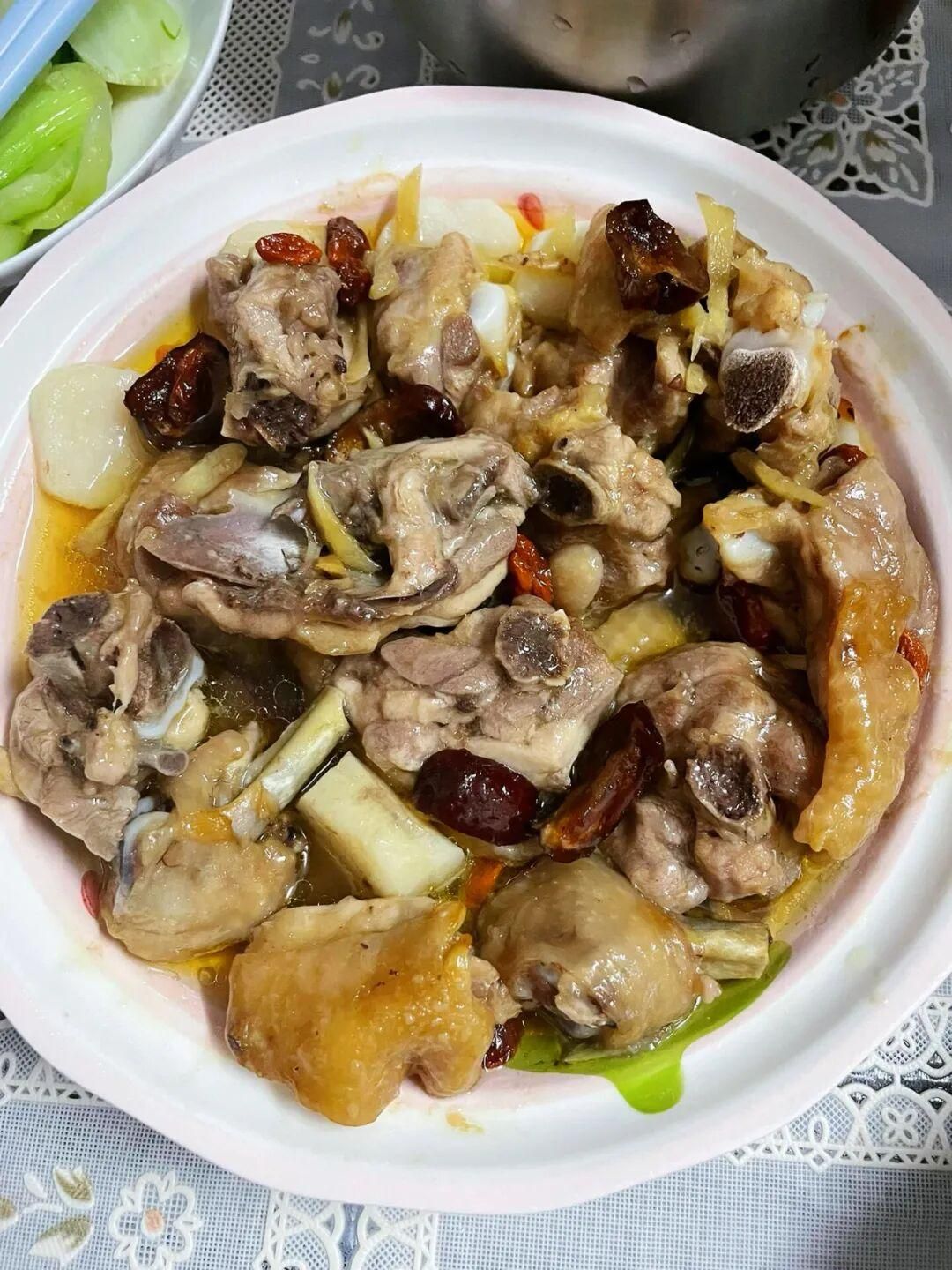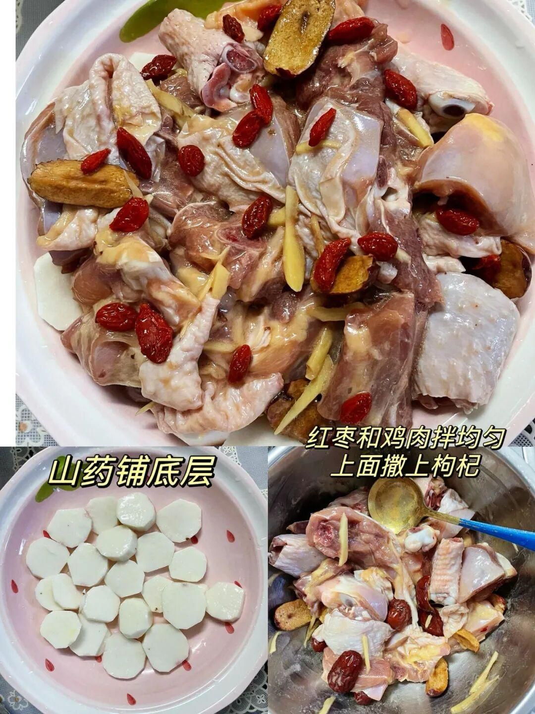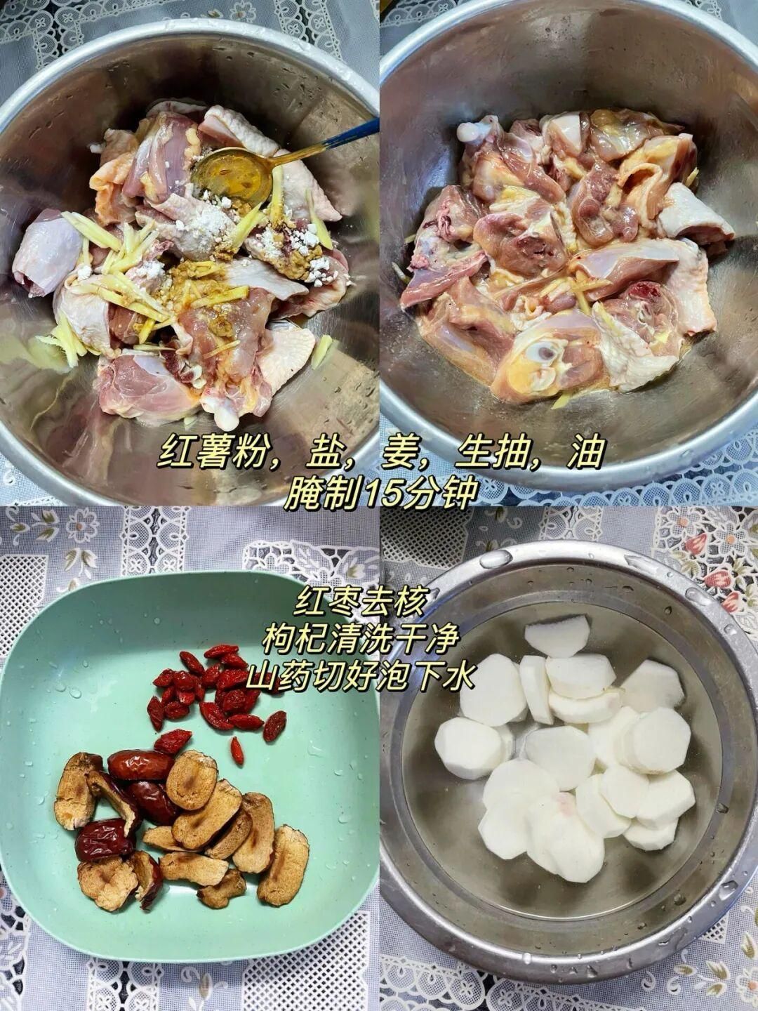 雞肉、紅棗、枸杞、山藥、姜、紅薯淀粉、生抽、油
