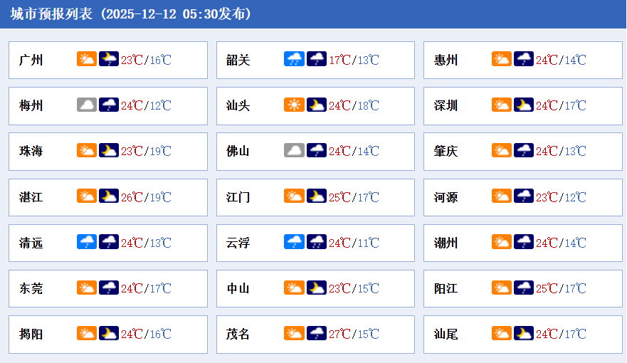 12日,粵北、珠江三角洲北部市縣陰天有小到中雨,其余市縣多云到陰天,局部有小雨;大部市縣早晚有輕霧或霧。早晨最低氣溫:粵北市縣12~15℃,珠三角南部和粵西市縣18~21℃,其余市縣15~18℃。