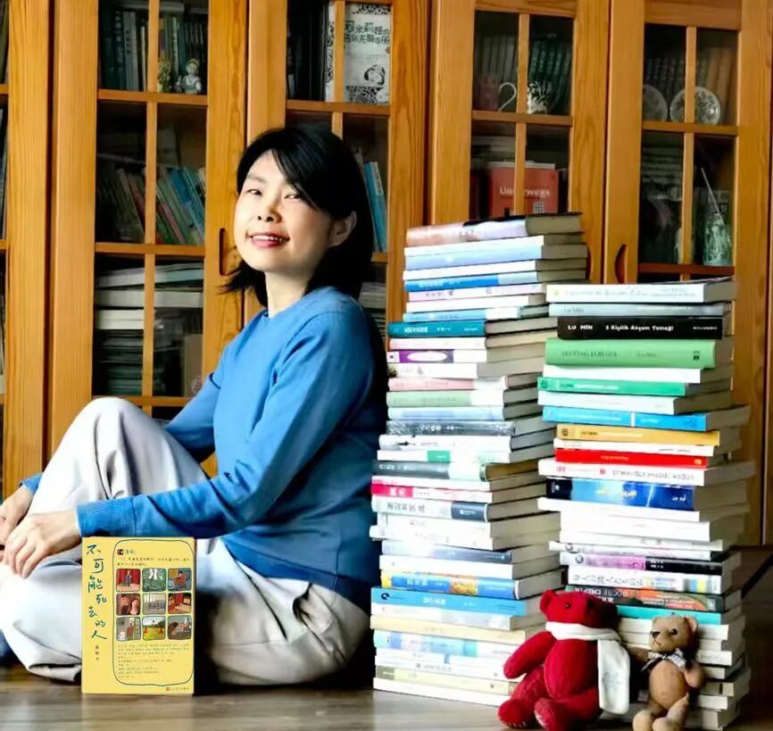 書店一角靜靜躺著一只碩大的毛絨玩具熊,閑聊中,魯敏突然一路小跑,把熊抱到沙發上,要和它合影。摟著毛茸茸的胳膊,眼睛笑成了兩道彎……