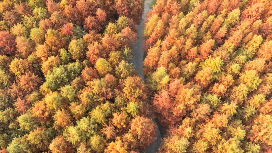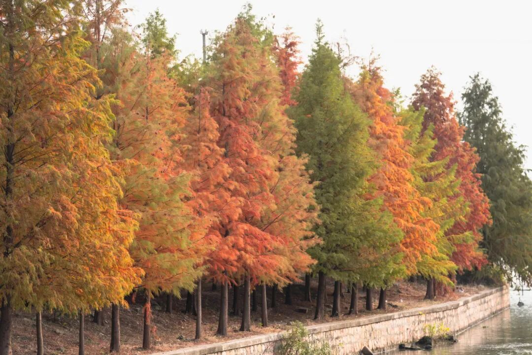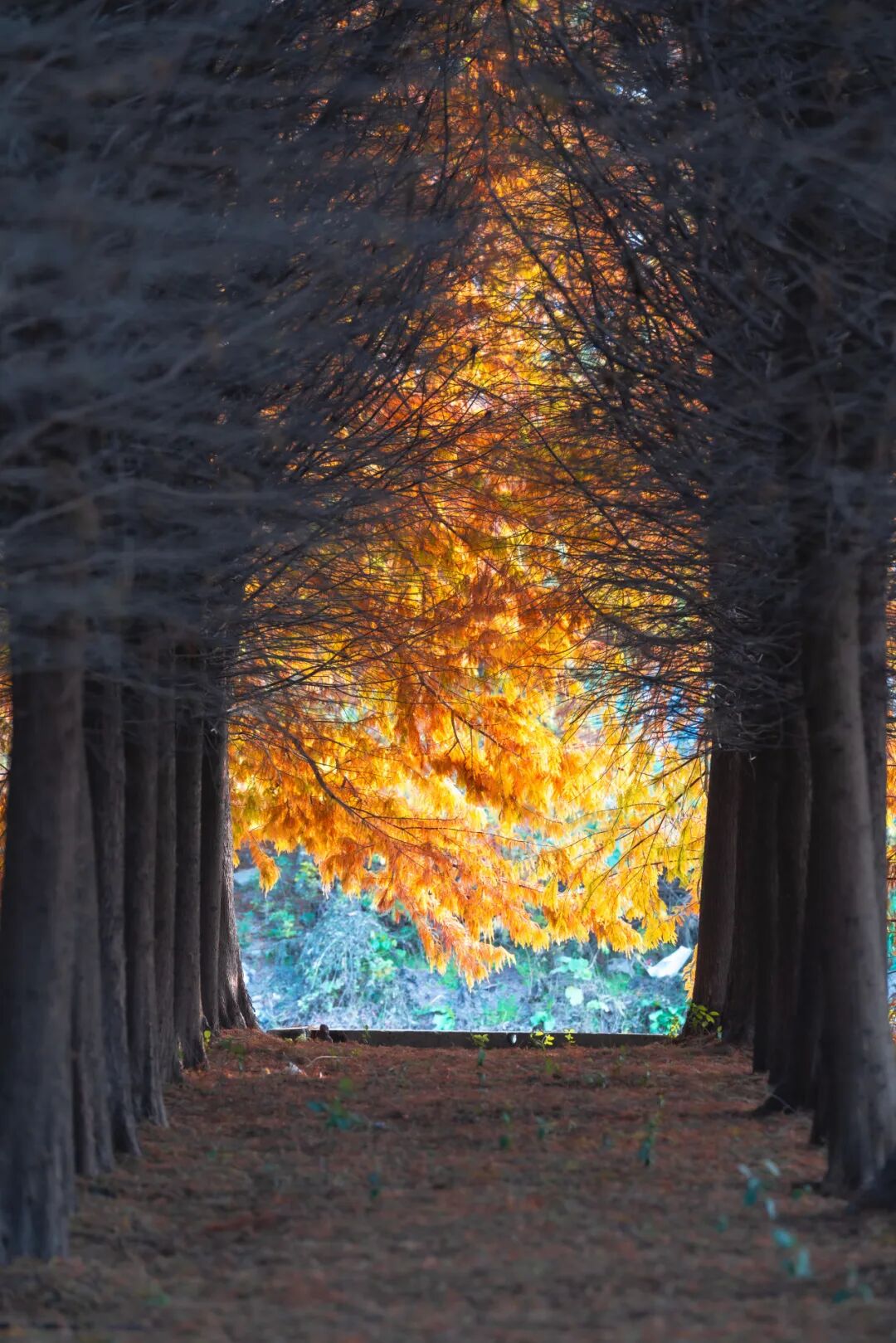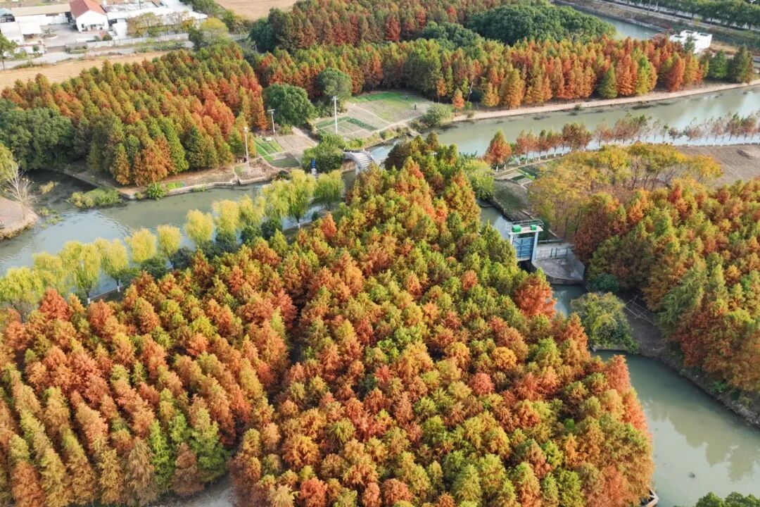 沿金橫路向東,穿過大片田野,到達金米村的秘境紅杉林,現在的杉樹正處在最佳變色期,堪稱青浦版“喀納斯”。