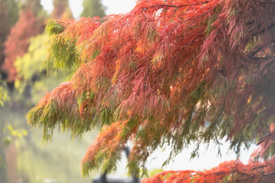 陽光穿過枝葉灑下斑駁光影,腳下堆積的落葉厚厚的,踩上去發出沙沙的輕響,微風拂過,紅葉如紅蝶翩躚,連空氣都彌漫著浪漫氣息。站在林中遠眺,紅杉倒影映在水面,仿佛時光都在此刻靜止。
