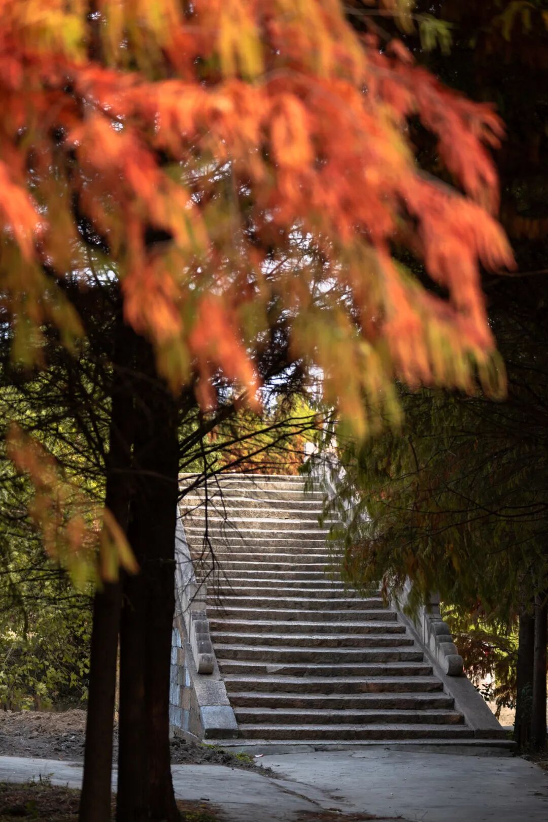 筆直挺拔的杉樹如同列隊的衛士,枝葉間暈染著深淺不一的色彩,有的已是熱烈的朱紅,有的綴著溫暖的鵝黃,有的則還殘留著盛夏的墨綠,三色交織,層林盡染,隨手一拍都是油畫質感。
