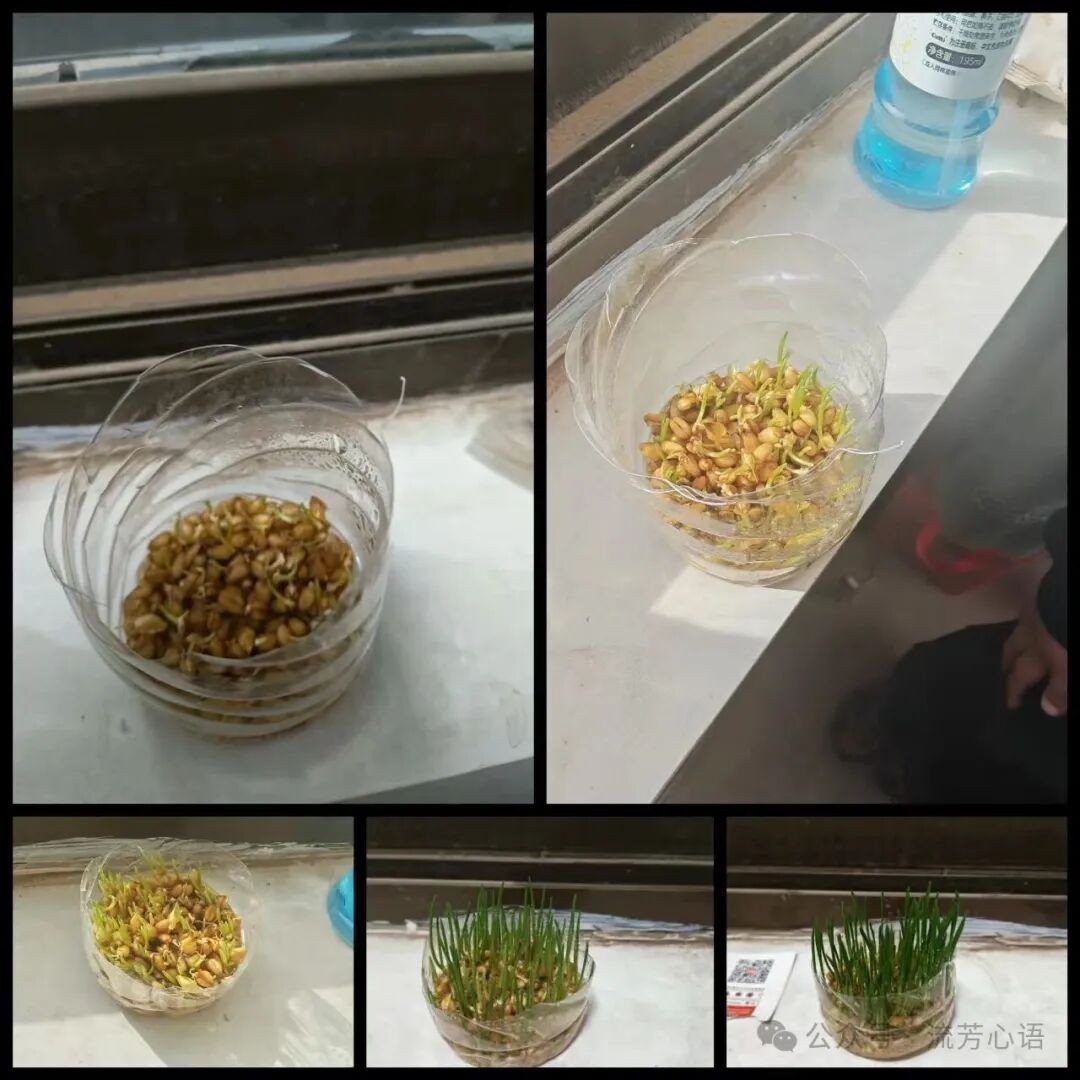 班會結束后,小朋友們開啟了水培觀察之旅。每天澆水、記錄,看著小芽慢慢破土而出,大家不僅感受到了生命的力量,更懂得了糧食的來之不易。