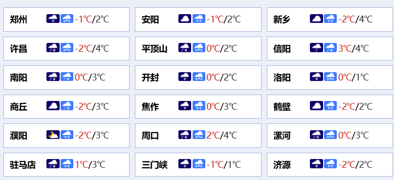 ?河南省氣象臺(tái)11日12時(shí)連續(xù)發(fā)布寒潮藍(lán)色預(yù)警、暴雪藍(lán)色預(yù)警、路結(jié)冰黃色預(yù)警,預(yù)計(jì)今天到明天,河南多地將出現(xiàn)5毫米以上降雪。14日凌晨較12日凌晨,最低氣溫下降10到12℃。詳情>>